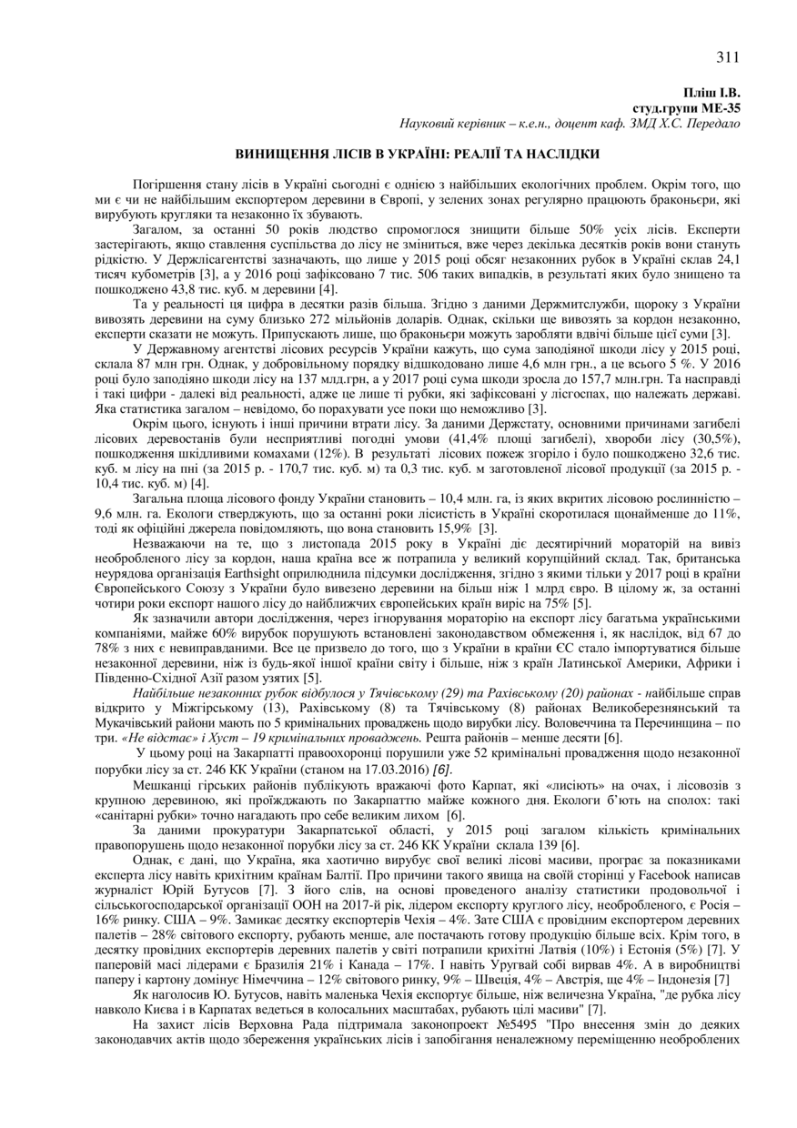 Пліш І. В. Винищення лісів в Україні: реалії та наслідки / І. В. Пліш, Х. С. Передало // 76-та Студентська науково-технічна конференція. Секція "Економіка і менеджмент" : збірник тез доповідей, жовтень – листопад 2018 року. — Львів : Видавництво Львівської політехніки, 2018. — С. 311–312. — (Управління зовнішньоекономічною діяльністю).