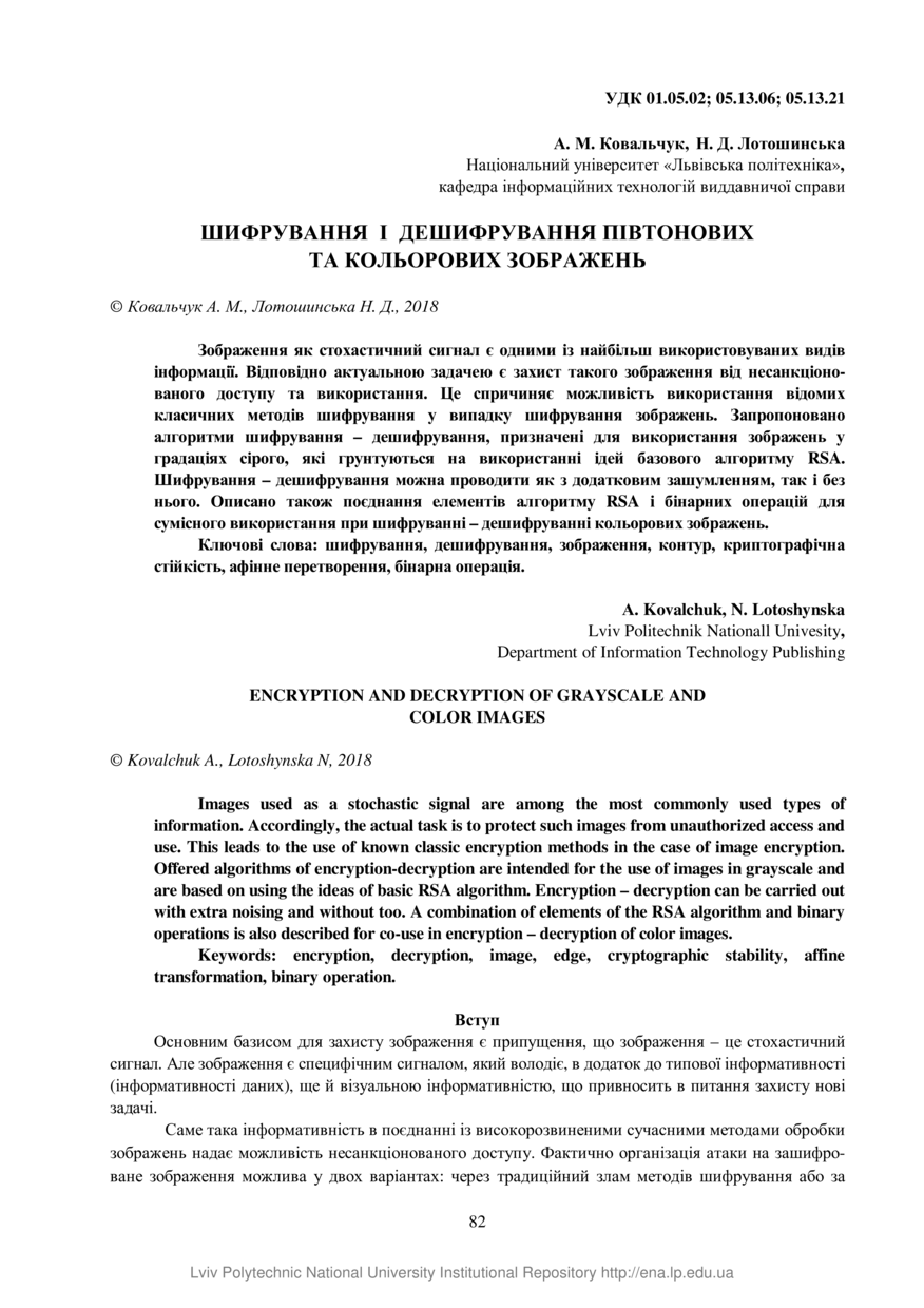 Ковальчук А. М. Шифрування і дешифрування півтонових та кольорових зображень / А. М. Ковальчук, Н. Д. Лотошинська // Вісник Національного університету “Львівська політехніка”. Серія: Комп’ютерні системи та мережі. — Львів : Видавництво Національного університету “Львівська політехніка”, 2018. — № 905. — С. 82–87.