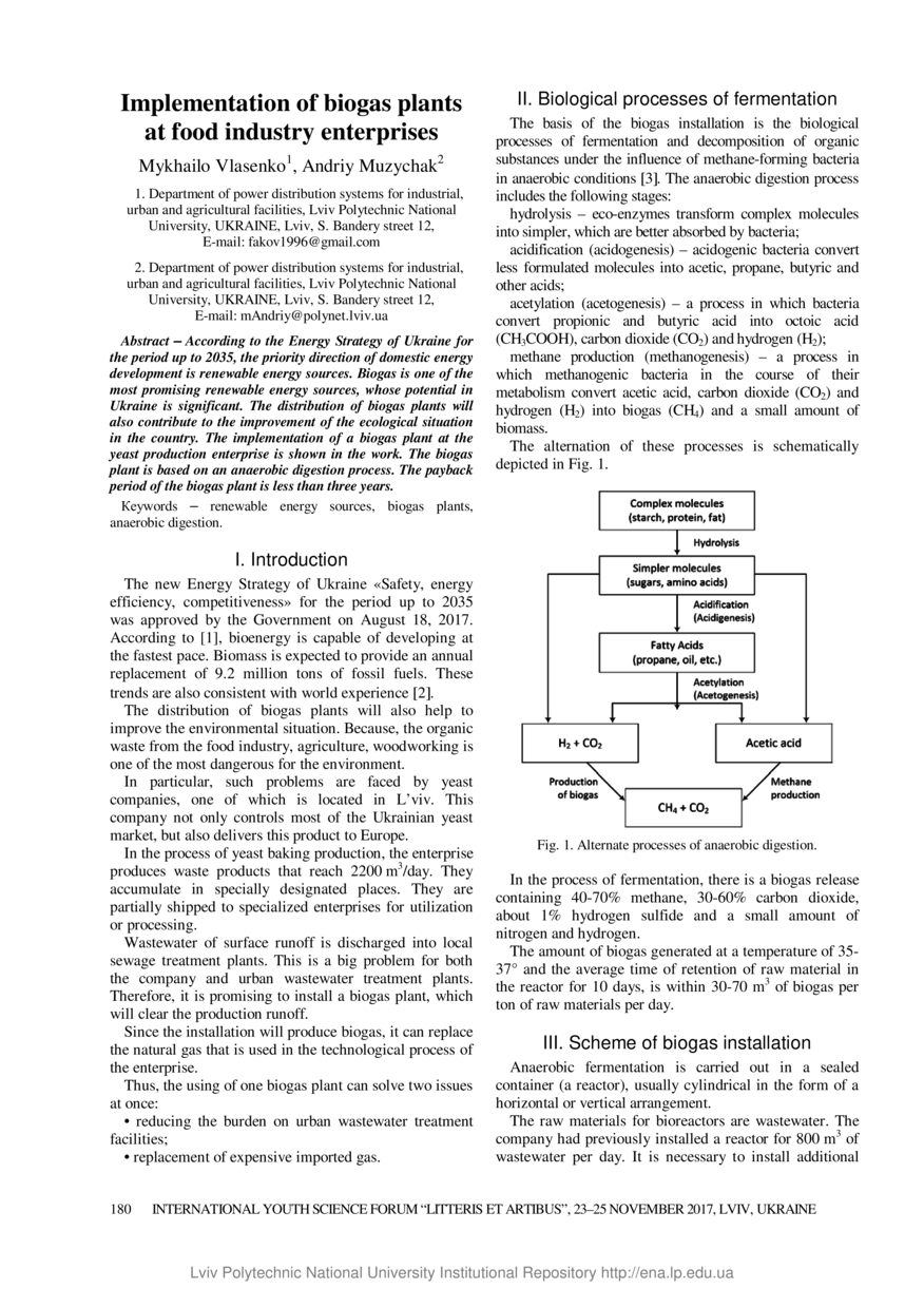 Vlasenko M. Implementation of biogas plants at food industry enterprises / Mykhailo Vlasenko, Andriy Muzychak // Litteris et Artibus : proceedings, 23–25 November, 2017. — Lviv : Lviv Polytechnic Publishing House, 2017. — P. 180–181. — (7th International academic conference «Electric power engineering & control systems 2017» (EPECS-2017)).