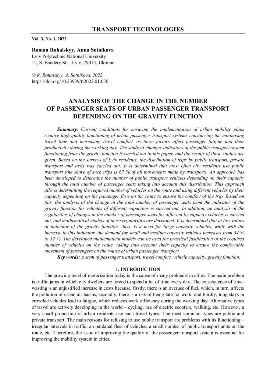 Rohalskyy R. Analysis of the change in the number of passenger seats of urban passenger transport depending on the gravity function / Roman Rohalskyy, Anna Sotnikova // Transport Technologies. — Lviv : Lviv Politechnic Publishing House, 2022. — Vol 3. — No 1. — P. 30–37.