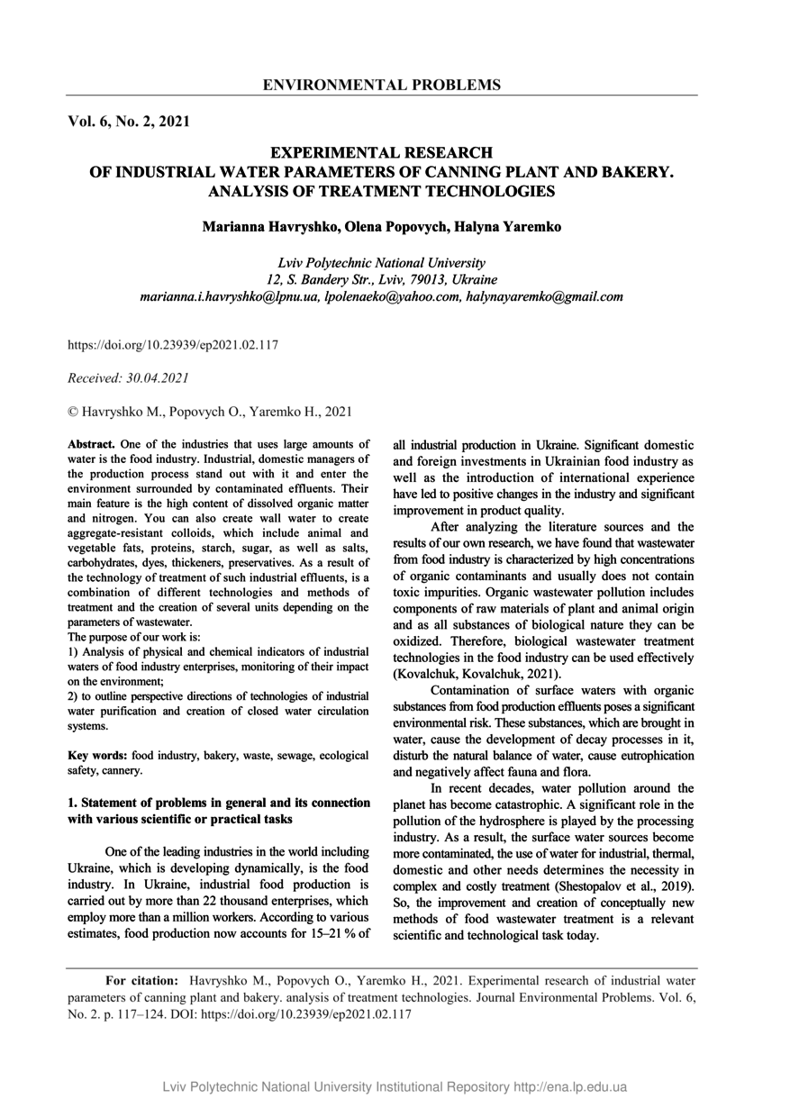 | dc.identifier.citation | Havryshko M. Experimental research of parameters of industrial waters of canning plant and bakery. Analysis of treatment technologies / Marianna Havryshko, Olena Popovych, Halyna Yaremko // Environmental Problems. — Lviv : Lviv Politechnic Publishing House, 2021. — Vol 6. — No 2. — P. 117–124. | |