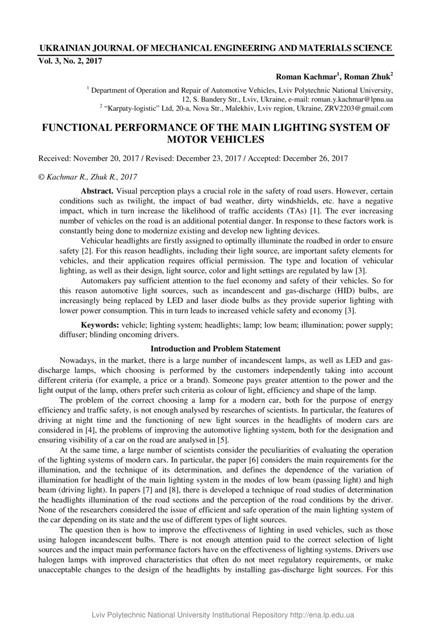 Kachmar R. Functional performance of the main lighting system of motor vehicles / Roman Kachmar, Roman Zhuk // Ukrainian Journal of Mechanical Engineering and Materials Science. — Lviv : Lviv Politechnic Publishing House, 2017. — Vol 3. — No 2. — P. 113–118.