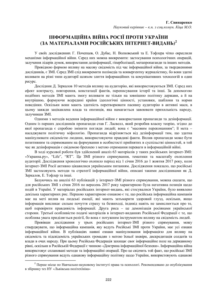 Свинаренко Г. Інформаційна війна Росії проти України (за матеріалами російських інтернет-видань) / Г. Свинаренко, М. О. Кіца // 76-та Студентська науково-технічна конференція. Секція права та психології : збірник тез доповідей, 15–29 жовтня 2018 року, Львів. — Львів : Видавництво Львівської політехніки, 2018. — С. 222–223. — (Журналістики та засобів масової комунікації).