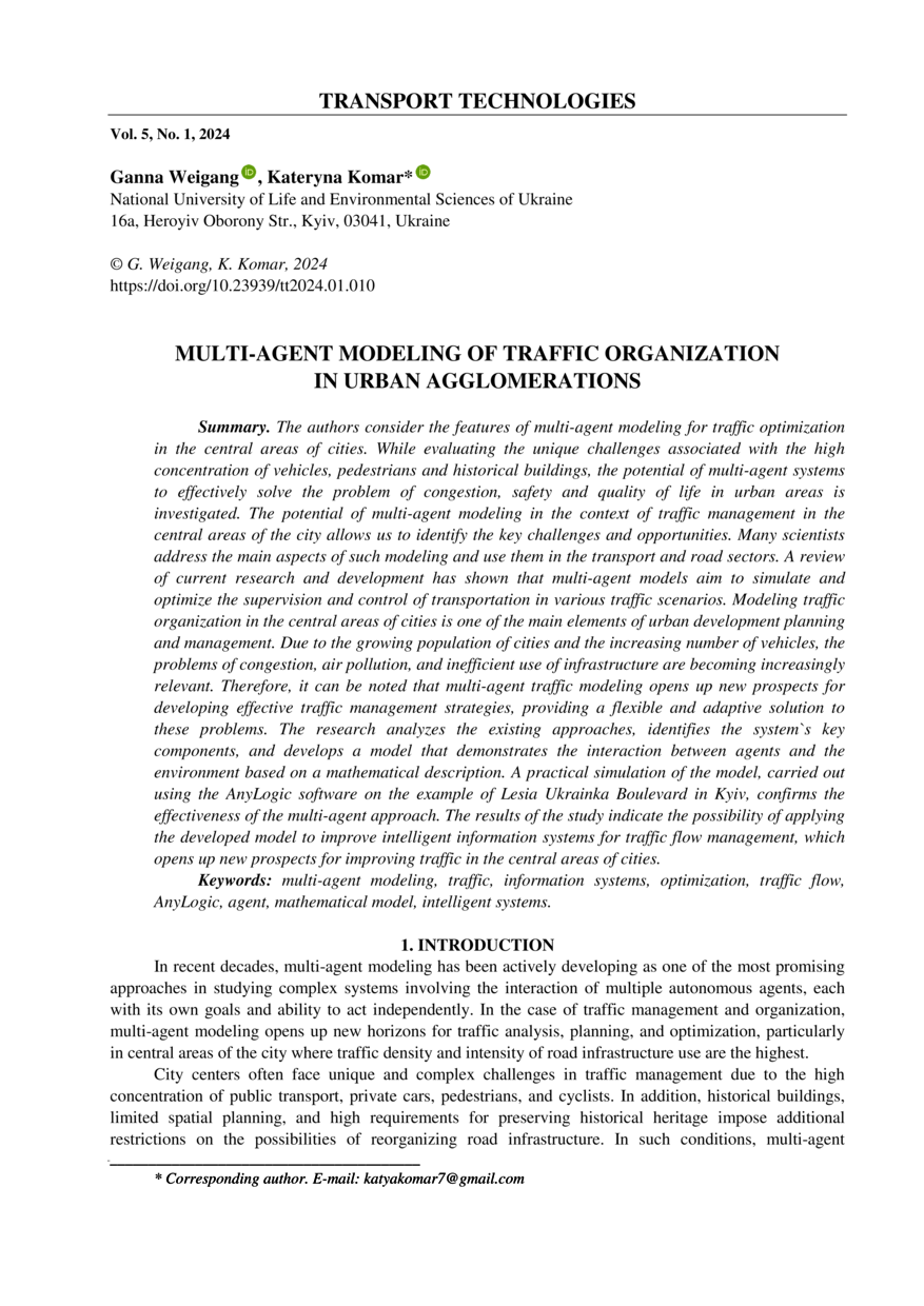 Weigang G. Multi-agent modeling of traffic organization in urban agglomerations / Ganna Weigang, Kateryna Komar // Transport Technologies. — Lviv : Lviv Politechnic Publishing House, 2024. — Vol 5. — No 1. — P. 10–22.