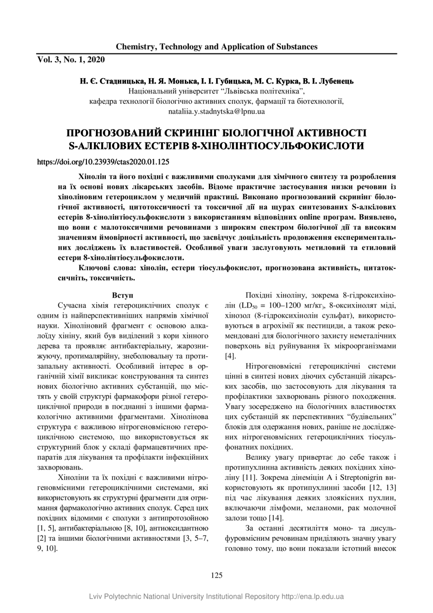 Прогнозований скринінг біологічної активності S-алкілових естерів 8-хінолінтіосульфокислоти / Н. Є. Стадницька, Н. Я. Монька, І. І. Губицька, М. С. Курка, В. І. Лубенець // Chemistry, Technology and Application of Substances. — Lviv : Lviv Politechnic Publishing House, 2020. — Том 3. — № 1. — С. 125–134.