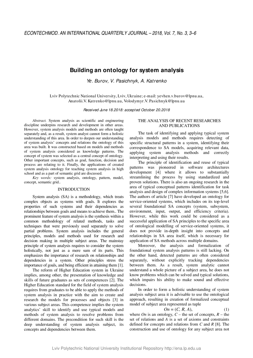 Burov Ye. Building an ontology for system analysis / Ye. Burov, V. Pasichnyk, A. Katrenko // Econtechmod. — Lublin, 2018. — Vol 7. — No 3. — P. 3–6.