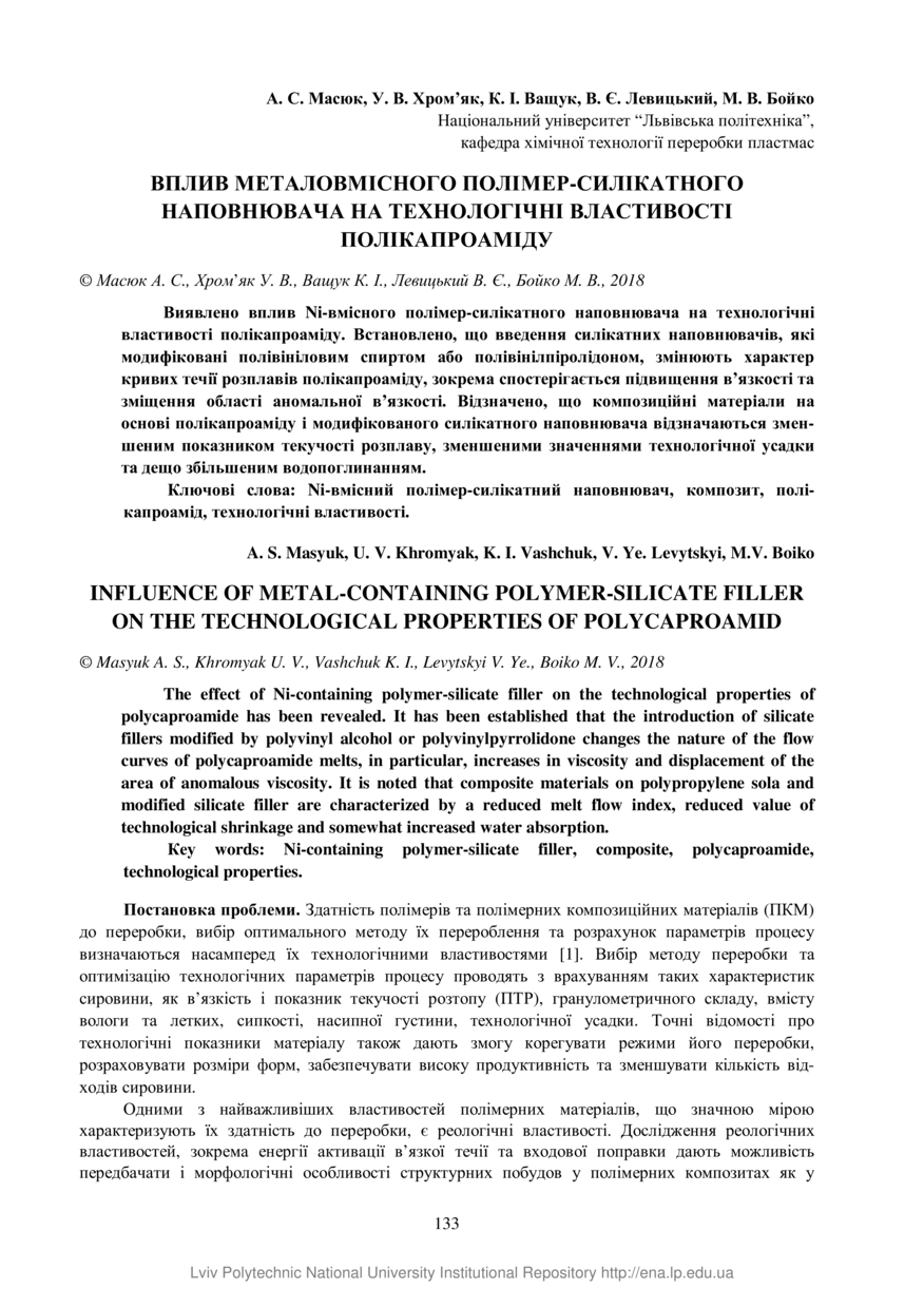 Вплив металовмісного полімер-силікатного наповнювача на технологічні властивості полікапроаміду / А. С. Масюк, У. В. Хром’як, К. І. Ващук, В. Є. Левицький, М. В. Бойко // Chemistry, Technology and Application of Substance. — Lviv : Lviv Politechnic Publishing House, 2018. — Vol 1. — No 1. — P. 133–138.