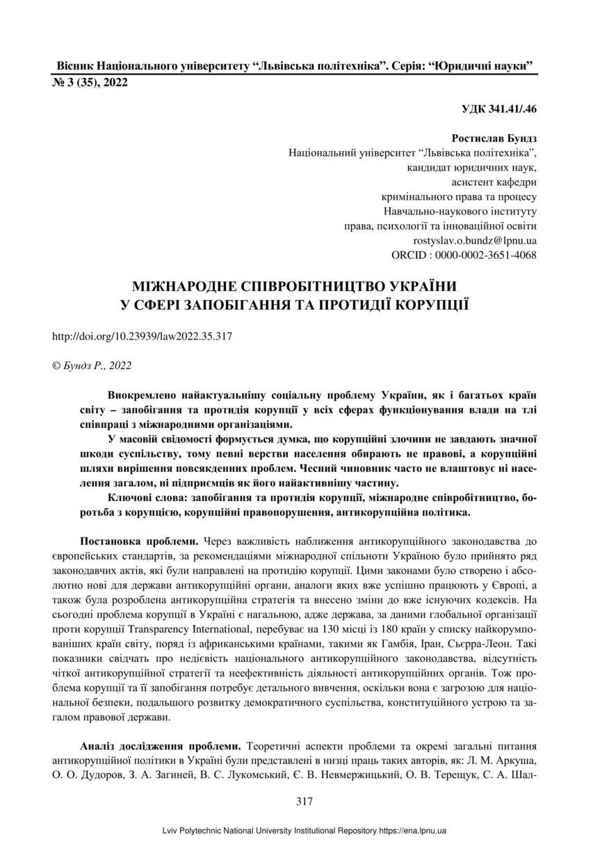 Бундз Р. Міжнародне співробітництво України у сфері запобігання та протидії корупції / Ростислав Бундз // Вісник Національного університету “Львівська політехніка”. Серія: “Юридичні науки”. — Львів : Видавництво Львівської політехніки, 2022. — Том 9. — № 3 (35). — С. 317–323.