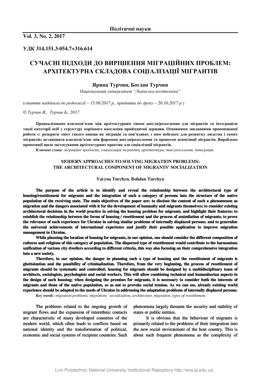 Turchyn Y. Modern approaches to solving migration problems: the architectural component of migrants’ socialization / Yaryna Turchyn, Bohdan Turchyn // Humanitarian Vision. — Lviv : Lviv Politechnic Publishing House, 2017. — Vol 3. — No 2. — P. 37–44.