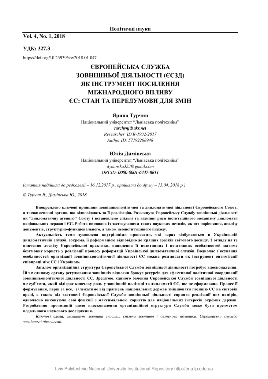 | dc.identifier.citationen | Turchyn Y. European external action service (EEAS) as an instrument for intensification of EU international influence: the state and the proposals for the changes / Yaryna Turchyn, Yuliia Dyminska // Humanitarian Vision. — Lviv : Lviv Politechnic Publishing House, 2018. — Vol 4. — No 1. — P. 47–54. | |