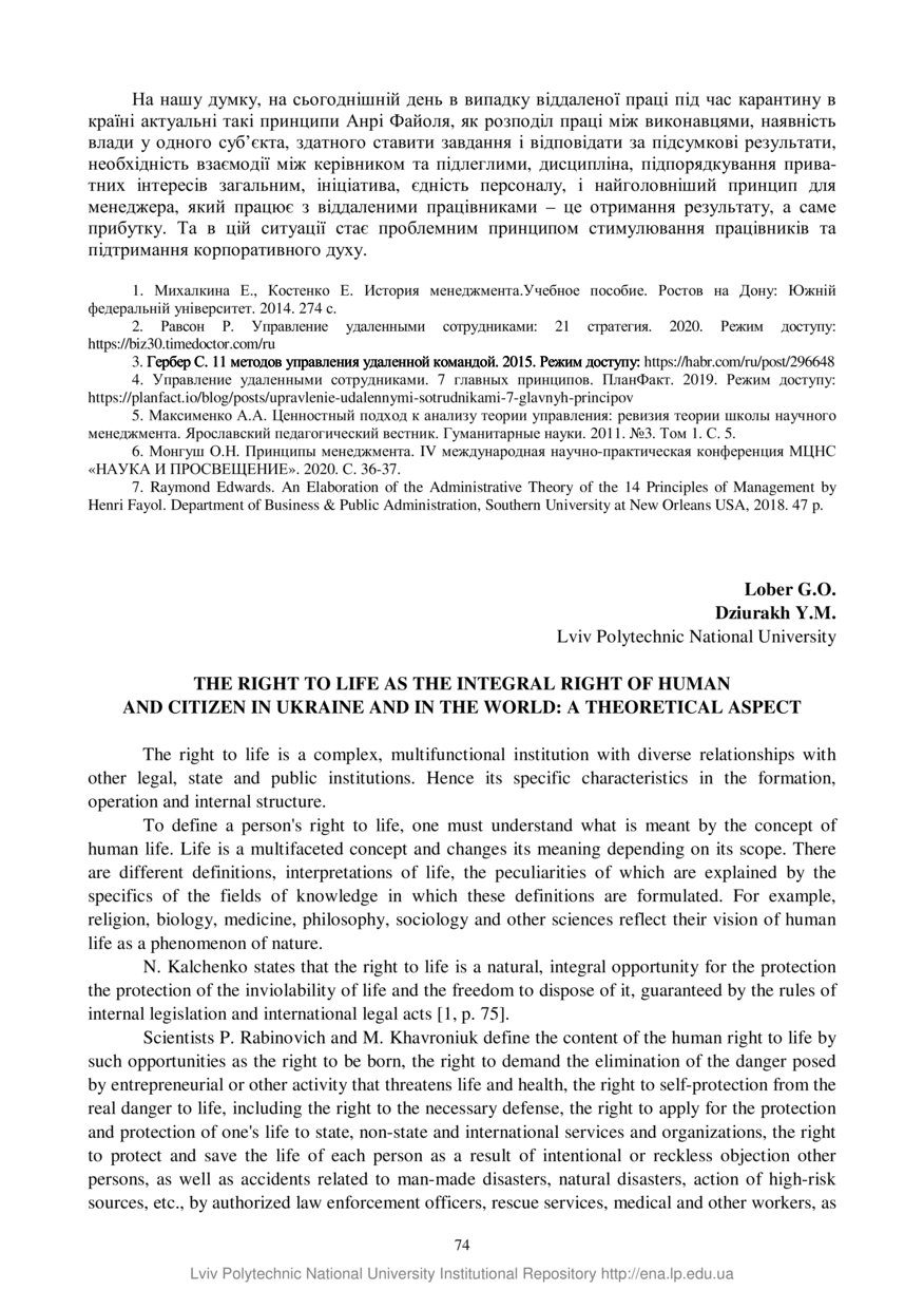 Lober G. O. The right to life as the integral right of human and citizen in Ukraine and in the world: a theoretical aspect / G. O. Lober, Y. M. Dziurakh // Управління інноваційним процесом в Україні: розвиток співпраці : тези доповідей VІІІ Міжнародної науково-практичної конференції, 18–20 червня 2020 року, Львів. — Львів : Видавництво Львівської політехніки, 2020. — С. 74–75. — (Людський та соціальний капітал в системі активаторів інноваційного процесу).