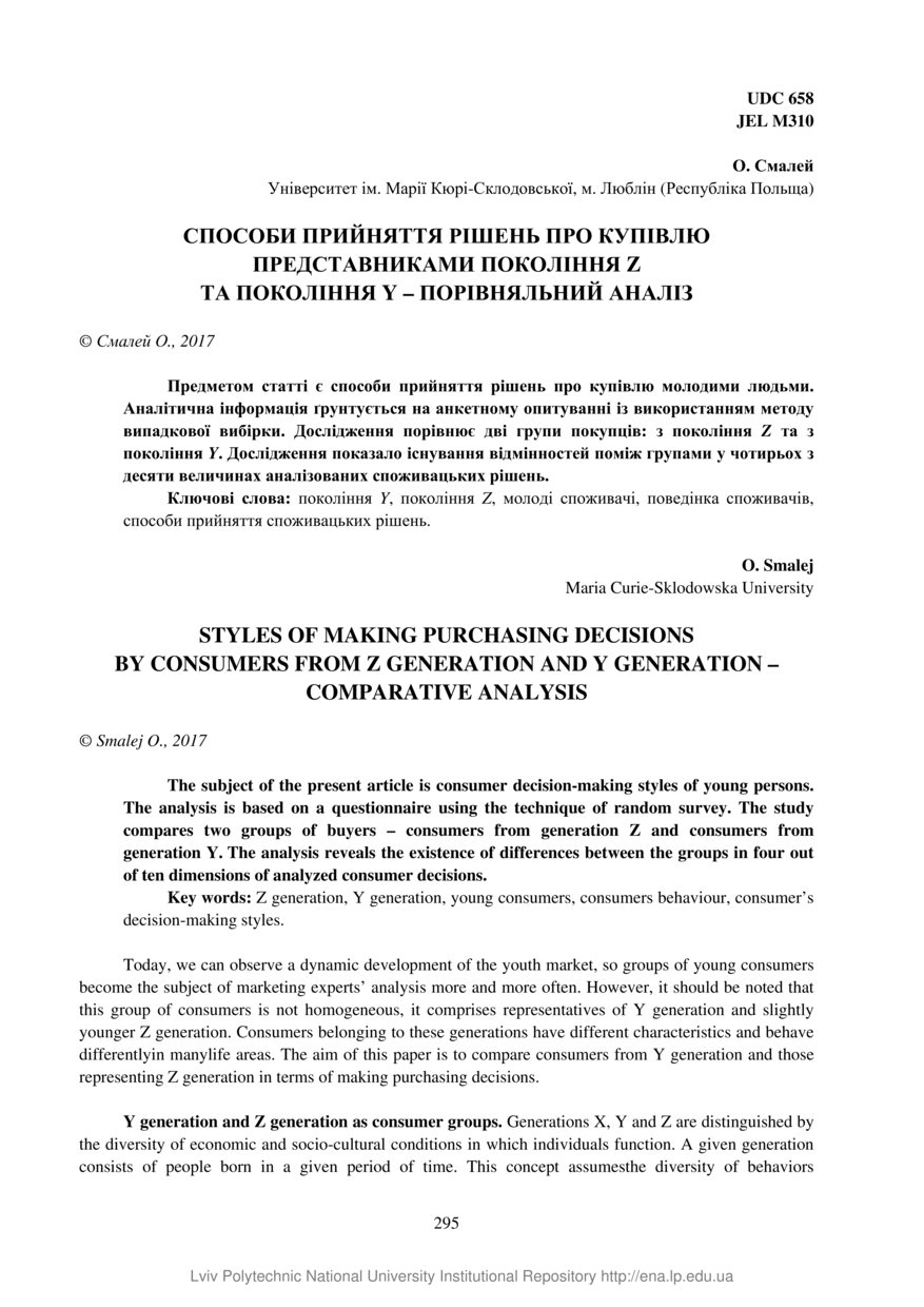 Smalej O. Styles of making purchasing decisions by consumers from Z generation and Y generation – comparative analysis / O. Smalej // Вісник Національного університету «Львівська політехніка». Серія: Логістика. — Львів : Видавництво Львівської політехніки, 2017. — № 863. — С. 295–299.