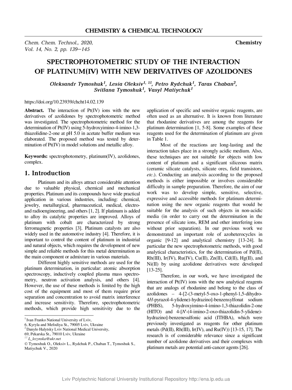 Spectrophotometric Study of the Interaction of Platinum(IV) with New Derivatives of Azolidones / Oleksandr Tymoshuk, Lesia Oleksiv, Petro Rydchuk, Taras Chaban, Svitlana Tymoshuk, Vasyl Matiychuk // Chemistry & Chemical Technology. — Lviv : Lviv Politechnic Publishing House, 2020. — Vol 14. — No 2. — P. 139–145.