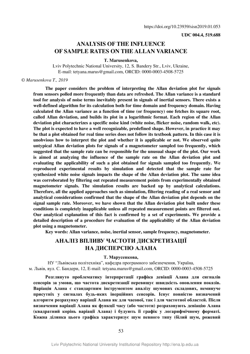 Marusenkova T. Analysis of the influence of sample rates on the Allan variance / Tetiana Marusenkova // Вісник Національного університету "Львівська політехніка". Інформаційні системи та мережі. — Львів : Видавництво Львівської політехніки, 2019. — № 5. — С. 53–61.