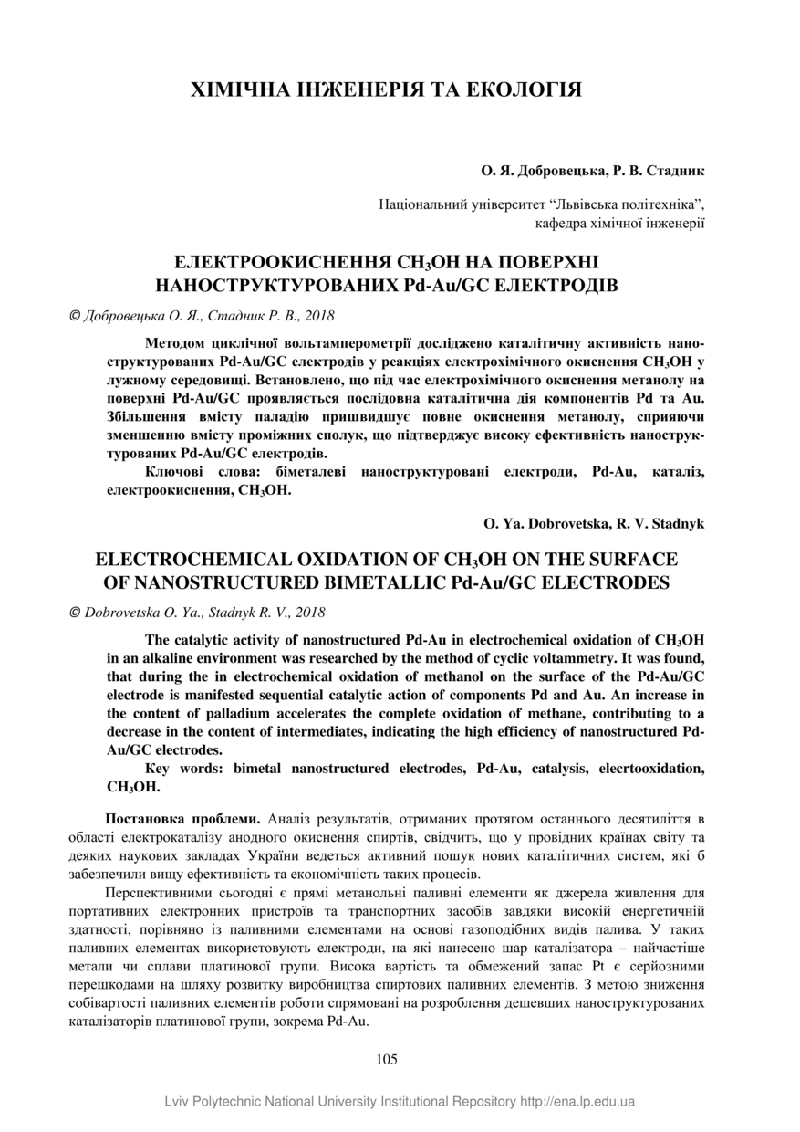 Добровецька О. Я. Електроокиснення CH3OH на поверхні наноструктурованих Pd-Au/GC електродів / О. Я. Добровецька, Р. В. Стадник // Chemistry, Technology and Application of Substances. — Lviv : Lviv Politechnic Publishing House, 2018. — Том 1. — № 2. — С. 105–110.