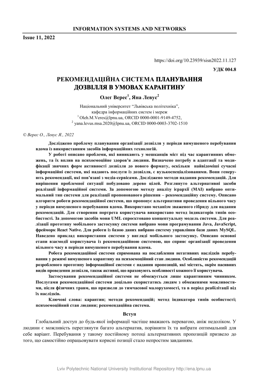 Верес О. Рекомендаційна система планування дозвілля в умовах карантину / Олег Верес, Яна Левус // Вісник Національного університету "Львівська політехніка". Інформаційні системи та мережі. — Львів : Видавництво Львівської політехніки, 2022. — № 11. — С. 127–144.
