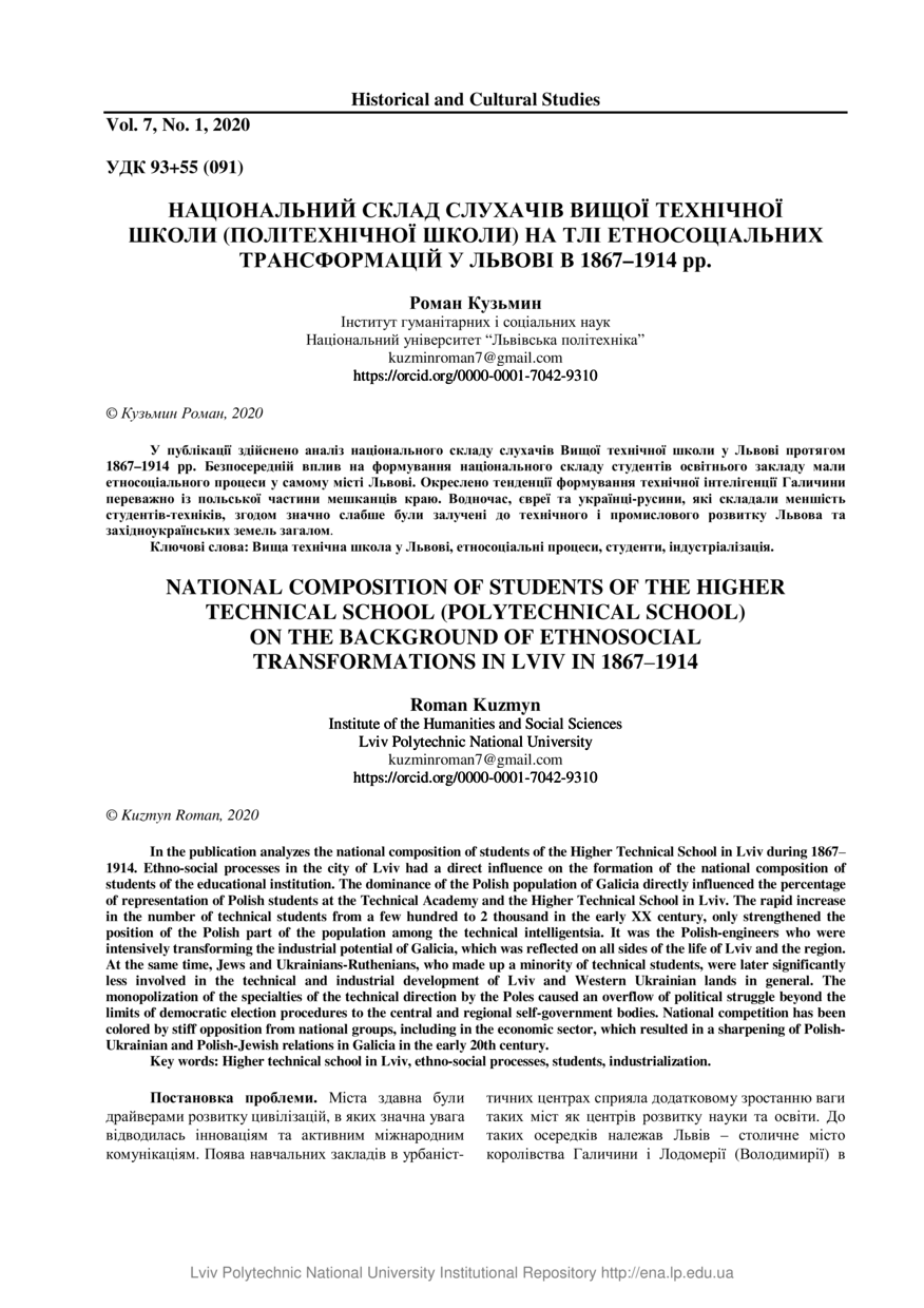 | dc.title.alternative | National composition of students of the Higher technical school (polytechnical school) on the background of ethnosocial transformations in Lviv in 1867–1914 | |