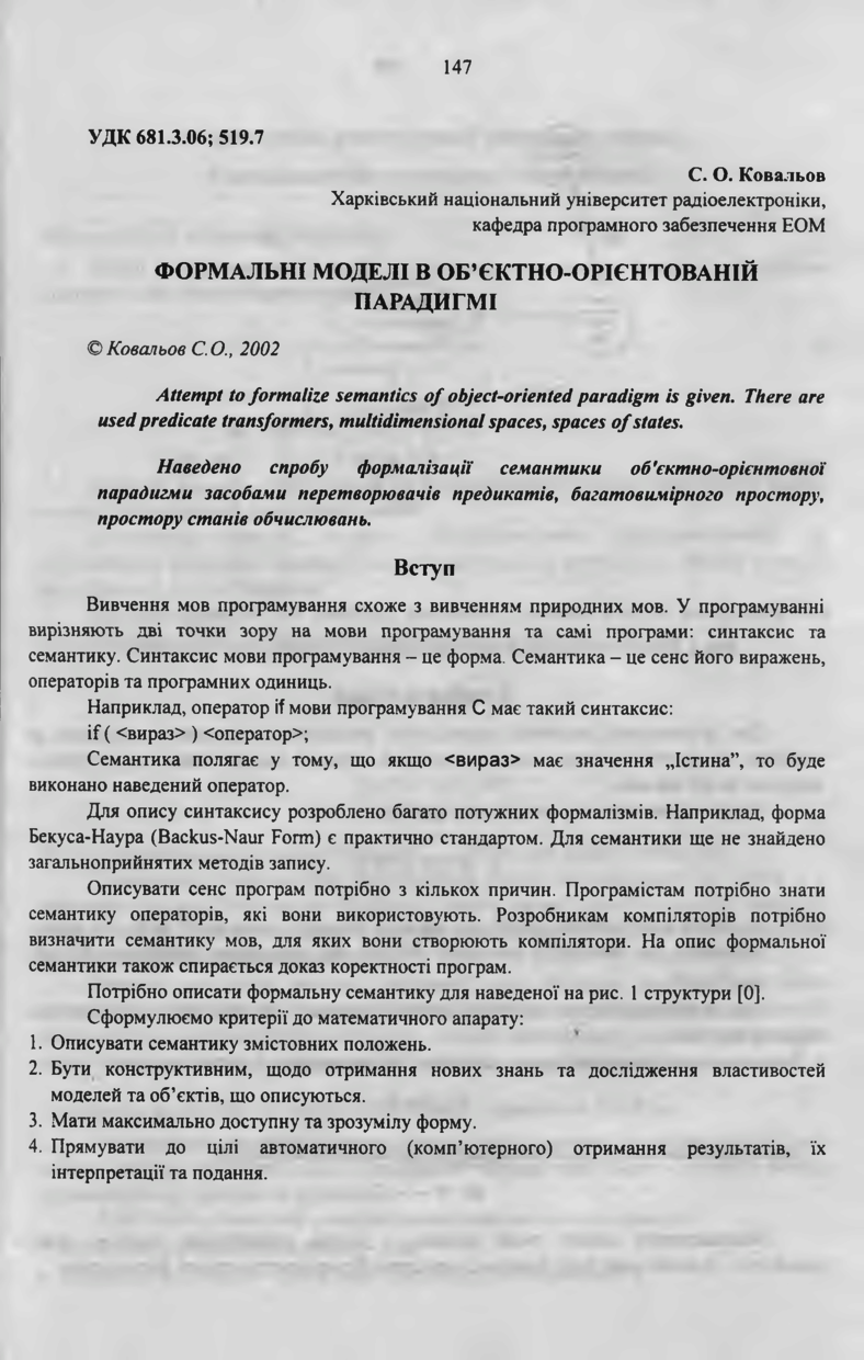 Ковальов С. О. Формальні моделі в об’єктно-орієнтованій парадигмі / С. О. Ковальов // Вісник Національного університету “Львівська політехніка”. — Львів : Видавництво Національного університету “Львівська політехніка”, 2002. — № 464 : Інформаційні системи та мережі. — С. 147–158.