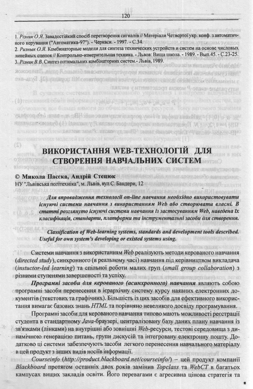 Пасека М. Використання Web-технологій для створення навчальних систем / М. Пасека, А. Стецюк // Вісник Національного університету “Львівська політехніка”. — Львів : Видавництво Національного університету “Львівська політехніка”, 2000. — № 413 : Комп’ютерна інженерія та інформаційні технології. — С. 120–127. — (Методи й алгоритми сучасних інформаційних технологій).