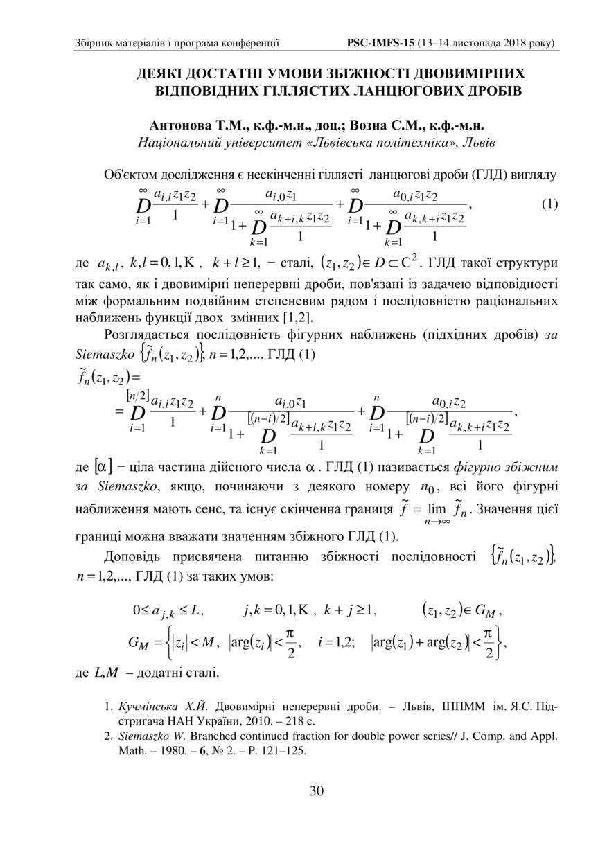 Антонова Т. М. Деякі достатні умови збіжності двовимірних відповідних гіллястих ланцюгових дробів / Т. М. Антонова, С. М. Возна // 15-та Відкрита наукова конференція Інституту прикладної математики та фундаментальних наук (ІМФН) : збірник матеріалів і програма конференції, 13–14 листопада 2018 року, Львів. — Львів : Видавництво Львівської політехніки, 2018. — С. 30. — (Математика).
