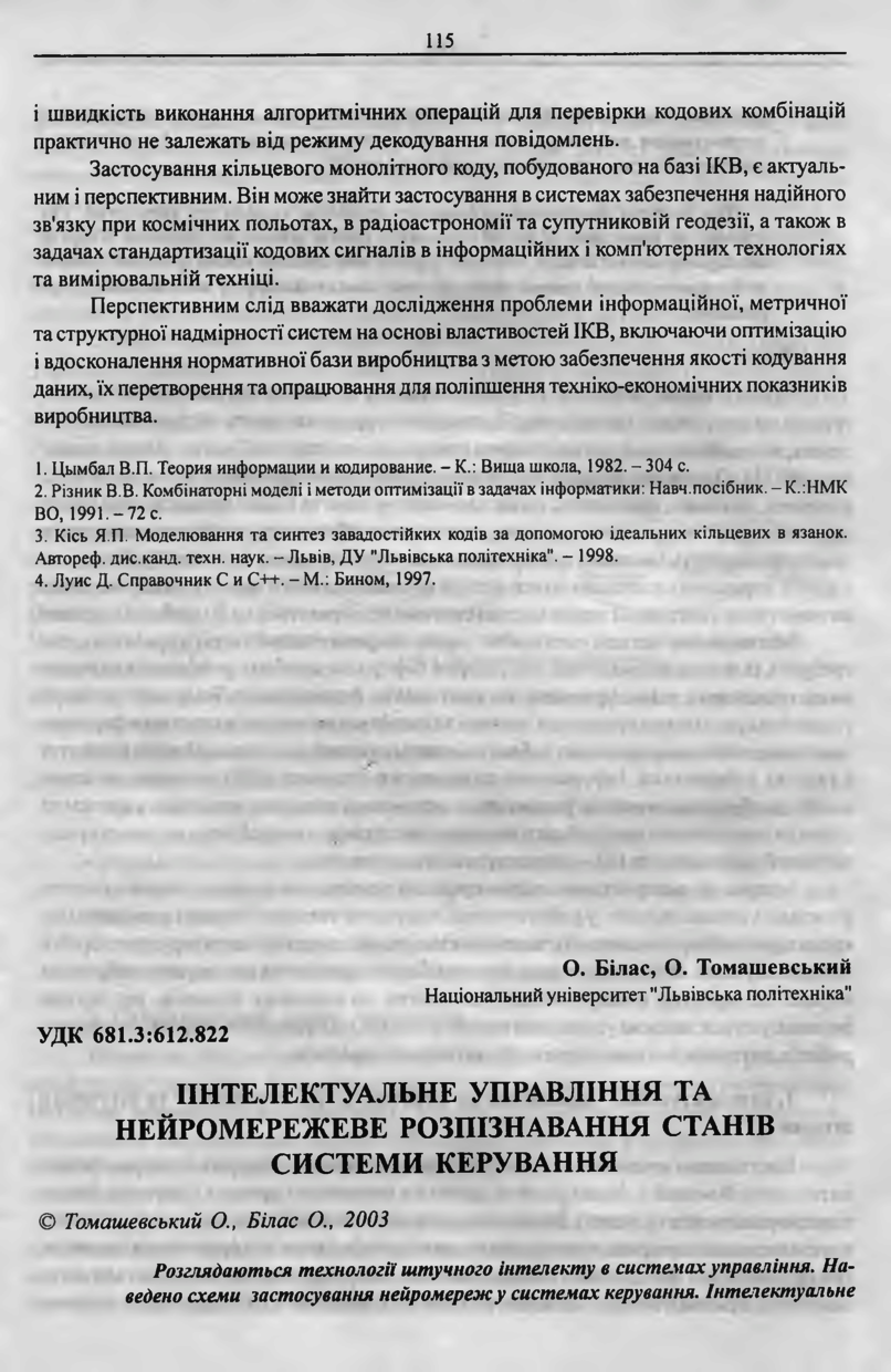 Білас О. Інтелектуальне управління та нейромережеве розпізнавання станів системи керування / О. Білас, О. Томашевський // Вісник Національного університету “Львівська політехніка”. — Львів : Видавництво Національного університету “Львівська політехніка”, 2003. — № 481 : Комп'ютерна інженерія та інформаційні технології. — С. 115–120. — (Методи й алгоритми сучасних інформаційних технологій).