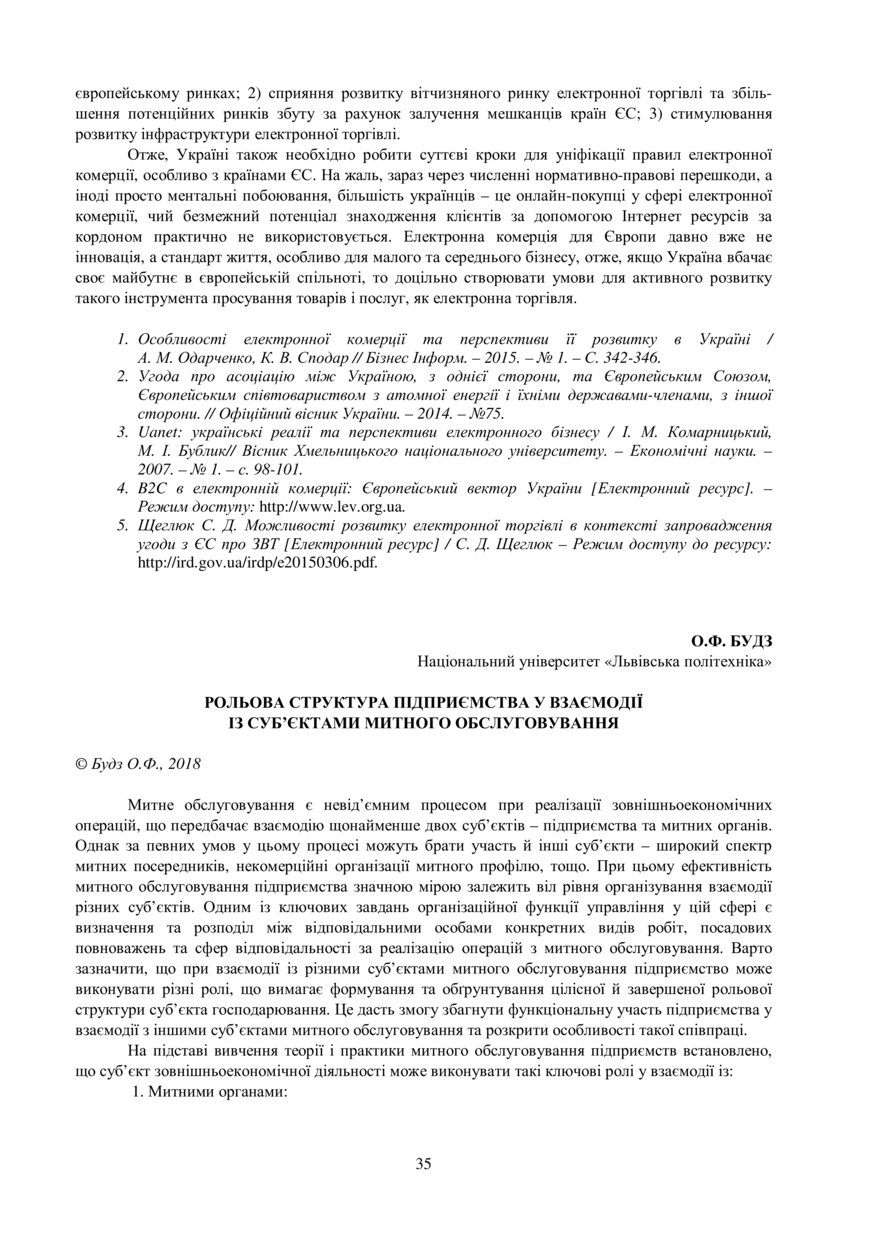 Будз О. Ф. Рольова структура підприємства у взаємодії із суб’єктами митного обслуговування / О. Ф. Будз // Маркетинг та логістика в системі менеджменту : тези доповідей XІI Міжнародної науково-практичної конференції, 25–27 жовтня 2018 року, Львів. — Львів : Видавництво Львівської політехніки, 2018. — С. 35–37.