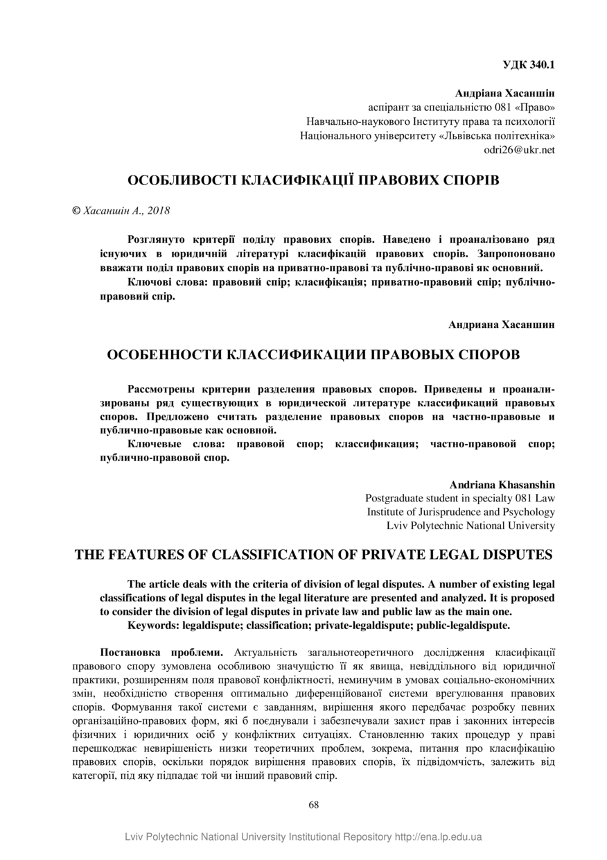 Хасаншін А. Особливості класифікації правових спорів / Андріана Хасаншін // Вісник Національного університету “Львівська політехніка”. Серія: Юридичні науки. — Львів : Видавництво Львівської політехніки, 2018. — № 902 (19). — С. 68–73.