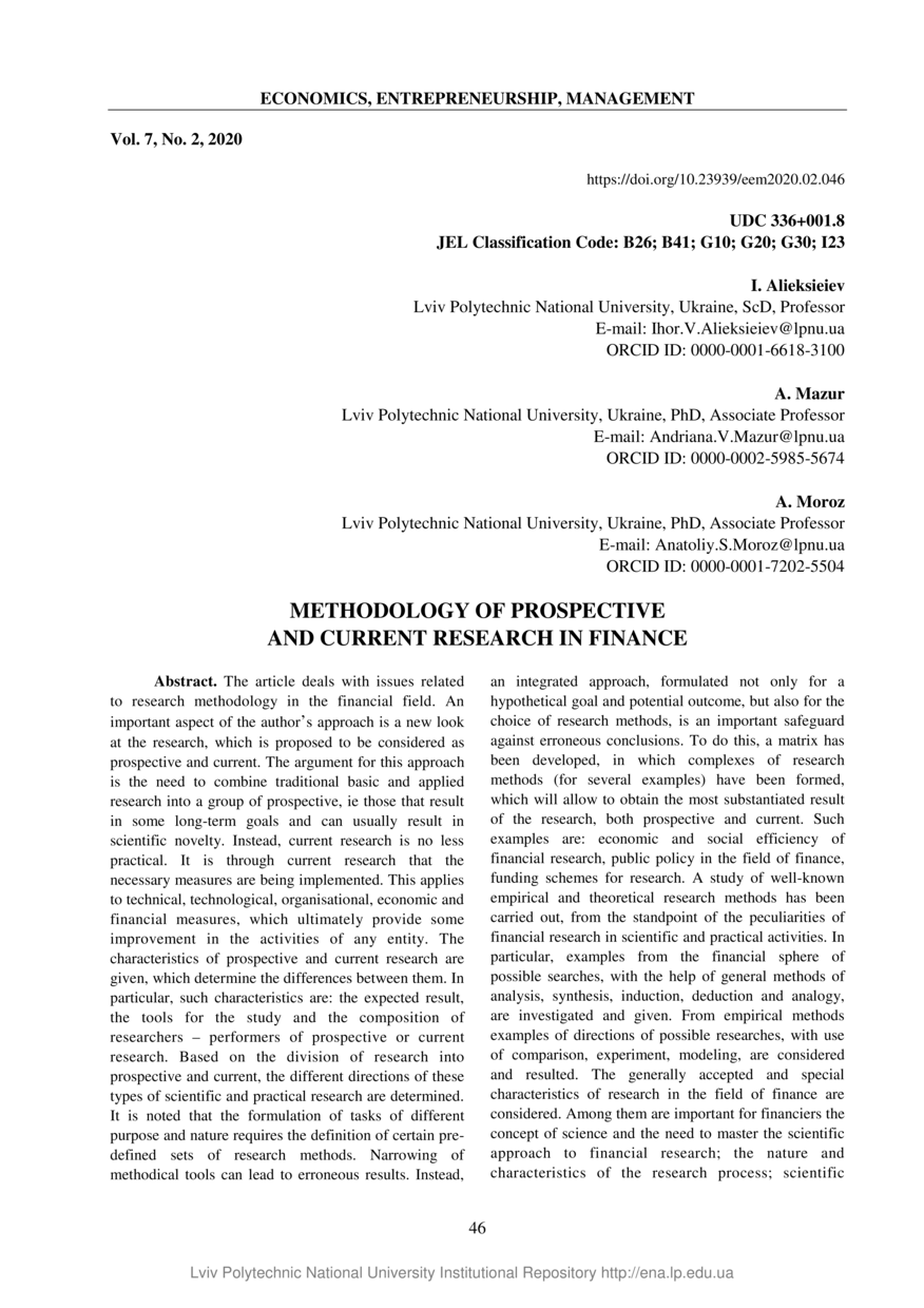 Alieksieiev I. Methodology of prospective and current research in finance / I. Alieksieiev, A. Mazur, A. Moroz // Economics, Entrepreneurship, Management. — Lviv : Lviv Politechnic Publishing House, 2020. — Vol 7. — No 2. — P. 46–60.