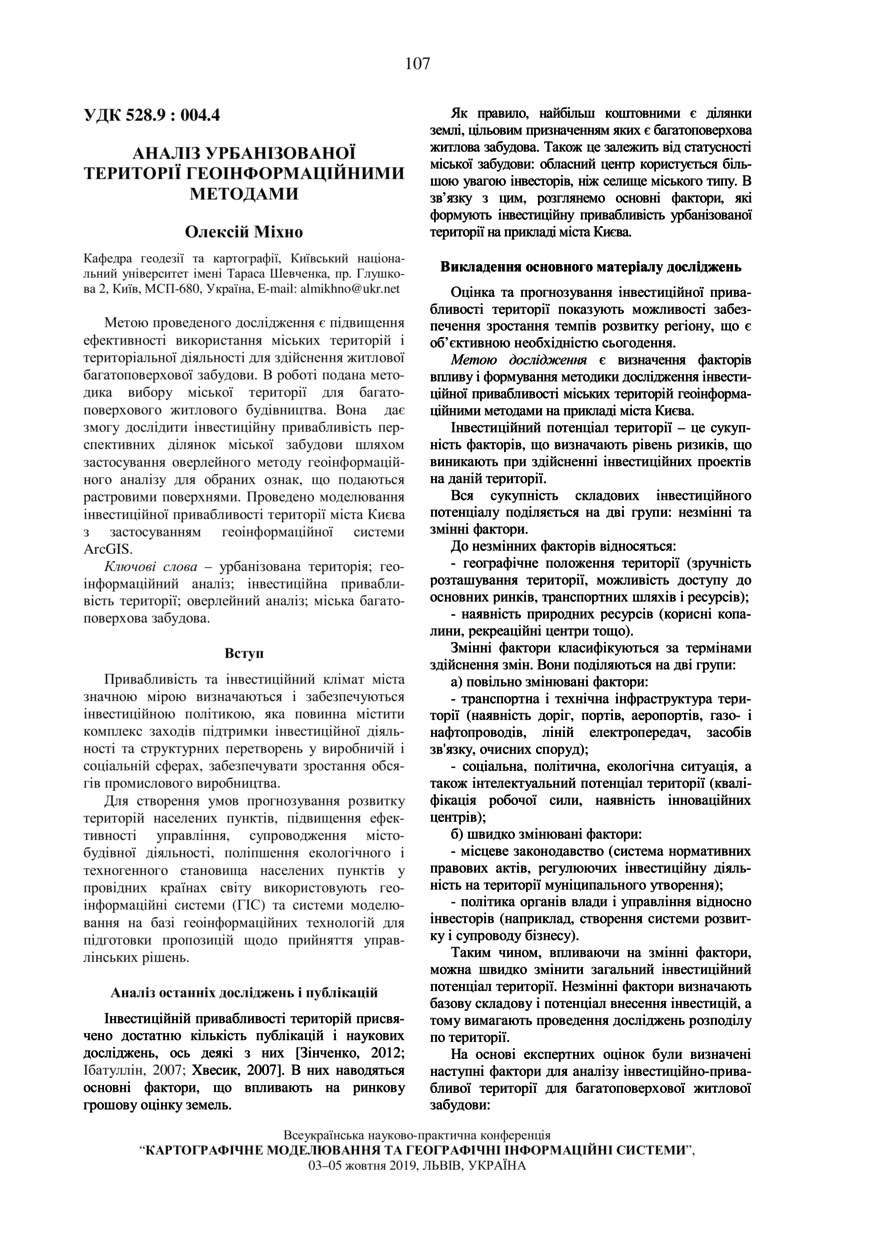Міхно О. Аналіз урбанізованої території геоінформаційними методами / Олексій Міхно // Картографічне моделювання та географічні інформаційні системи : збірник матеріалів всеукраїнської науково-практичної конференції, 3–5 жовтня 2019 року, Львів. — Львів : Видавництво Львівської політехніки, 2019. — С. 107–108.