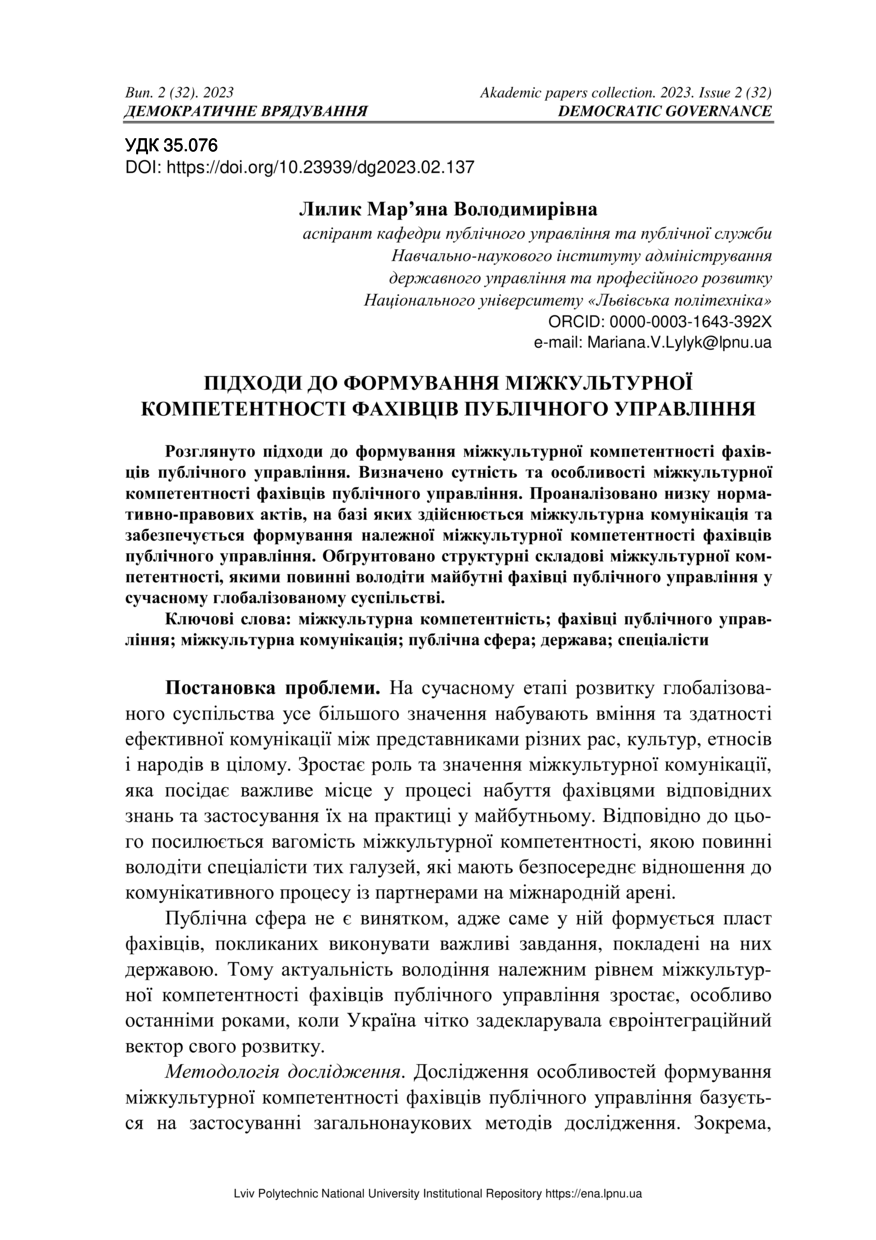 | dc.title.alternative | Approaches to the formation of intercultural competence of public administration specialists | |