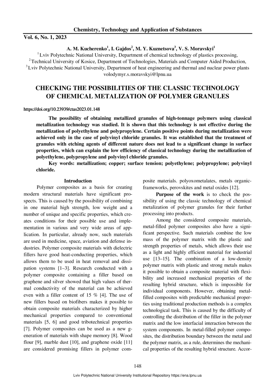 Checking the possibilities of the classic technology of chemical metalization of polymer granules / A. M. Kucherenko, I. Gajdos, M. Y. Kuznetsova, V. S. Moravskyi // Chemistry, Technology and Application of Substances. — Lviv : Lviv Politechnic Publishing House, 2023. — Vol 6. — No 1. — P. 148–153.