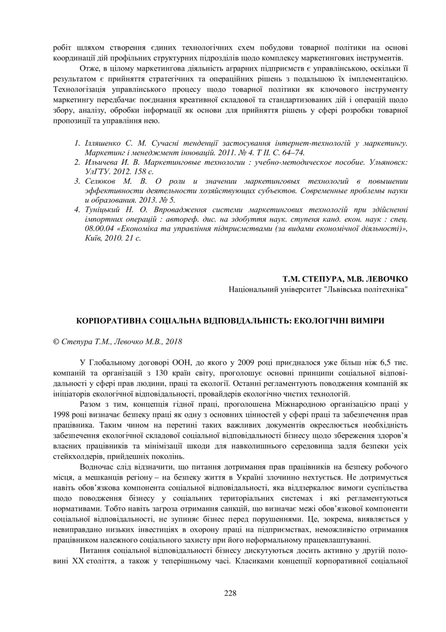 Степура Т. М. Корпоративна соціальна відповідальність: екологічні виміри / Т. М. Степура, М. В. Левочко // Маркетинг та логістика в системі менеджменту : тези доповідей XІI Міжнародної науково-практичної конференції, 25–27 жовтня 2018 року, Львів. — Львів : Видавництво Львівської політехніки, 2018. — С. 228–230.