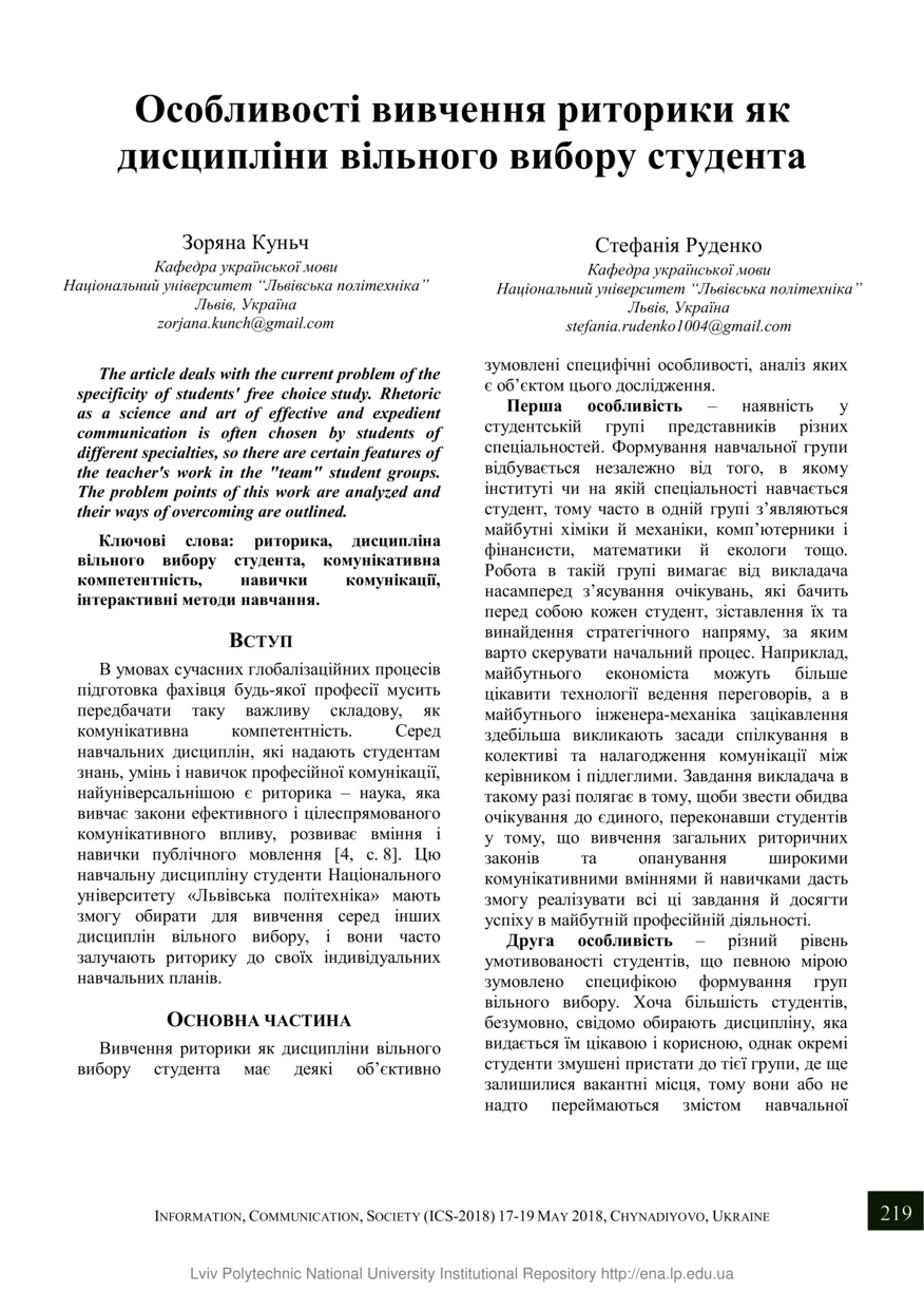 Куньч З. Особливості вивчення риторики як дисципліни вільного вибору студента / Зоряна Куньч, Стефанія Руденко // Інформація, комунікація, суспільство : матеріали 7-ї Міжнародної наукової конференції, 17–19 травня 2018 року, Чинадієво. — Львів : Видавництво Львівської політехніки, 2018. — С. 219–220. — (Психологічна та педагогічна компоненти документно-інформаційної діяльності).