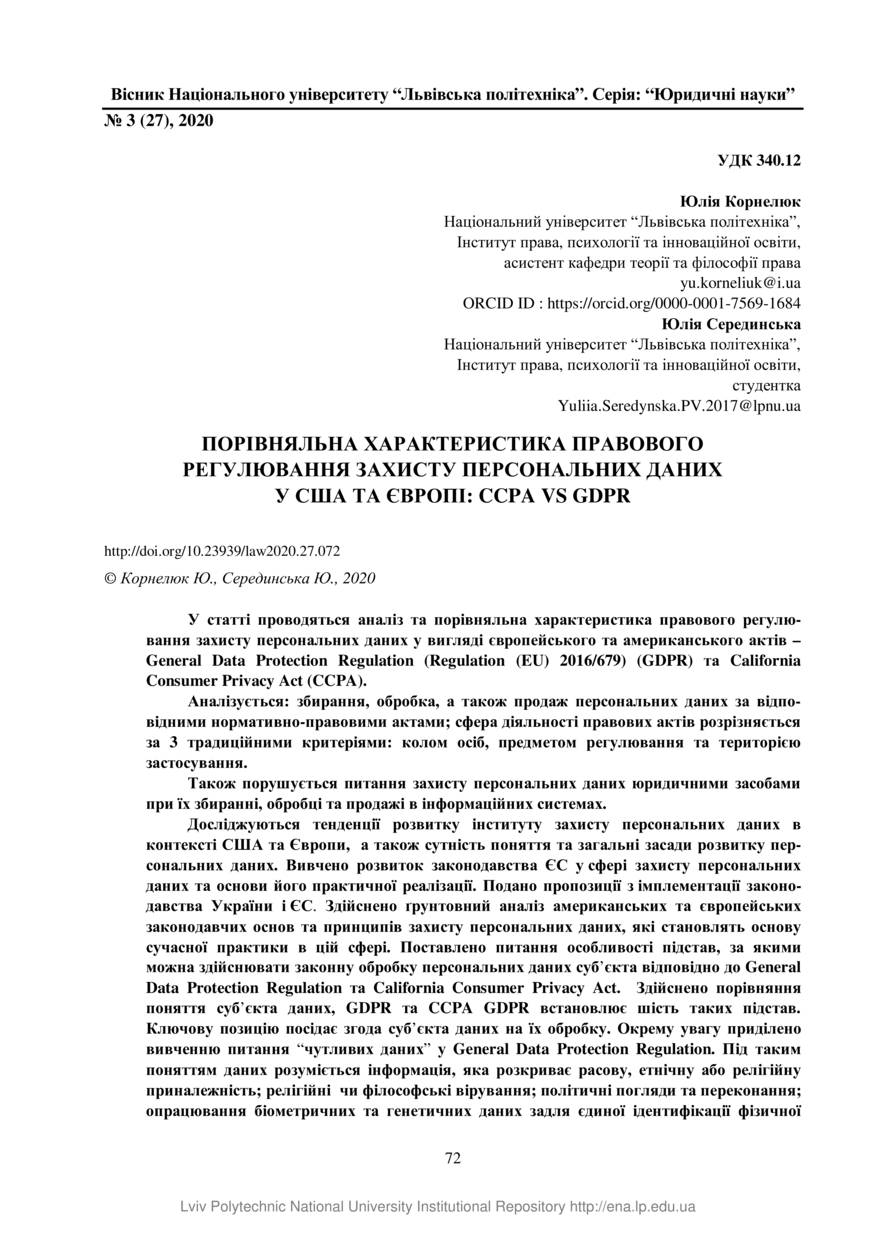 Корнелюк Ю. Порівняльна характеристика правового регулювання захисту персональних даних у США та Європі: CCPA vs GDPR / Юлія Корнелюк, Юлія Серединська // Вісник Національного університету “Львівська політехніка”. Серія: Юридичні науки. — Львів : Видавництво Львівської політехніки, 2020. — Том 7. — № 3 (27). — С. 72–77.