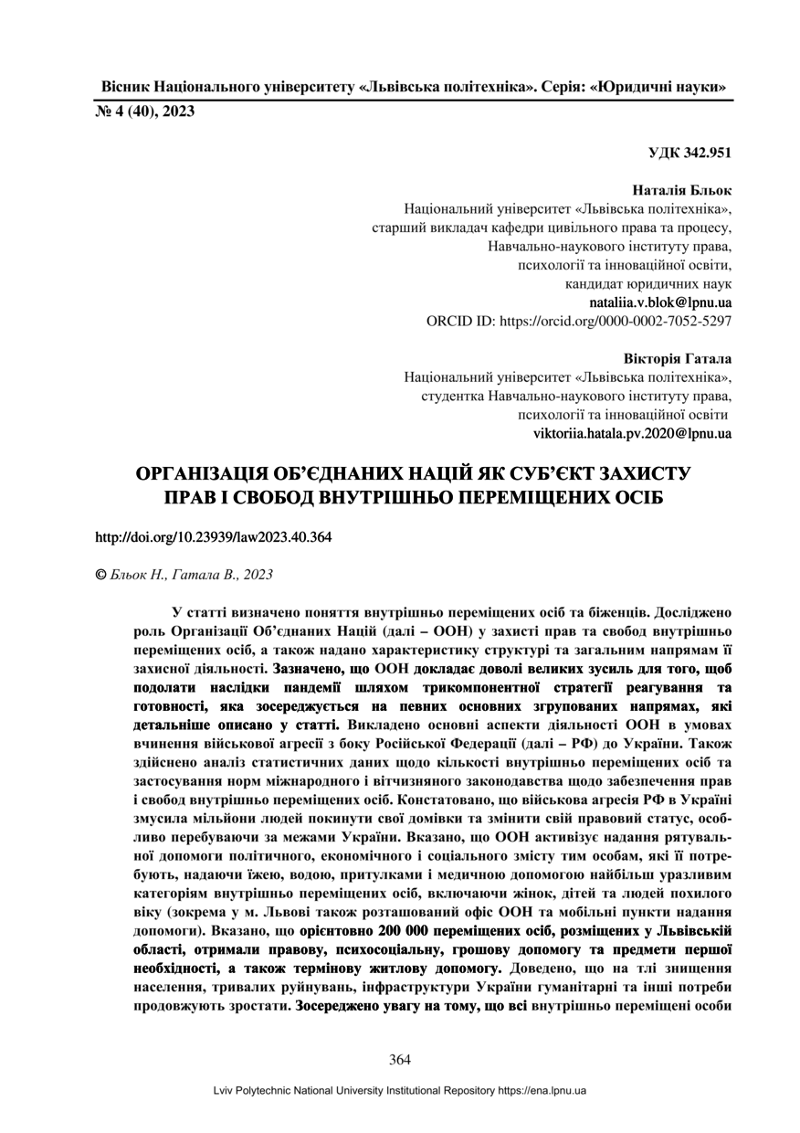 | dc.identifier.citation | Бльок Н. Організація Об’єднаних Націй як суб’єкт захисту прав і свобод внутрішньо переміщених осіб / Наталія Бльок, Вікторія Гатала // Вісник Національного університету «Львівська політехніка». Серія: Юридичні науки. — Львів : Видавництво Львівської політехніки, 2023. — № 4 (40). — С. 364–371. | |