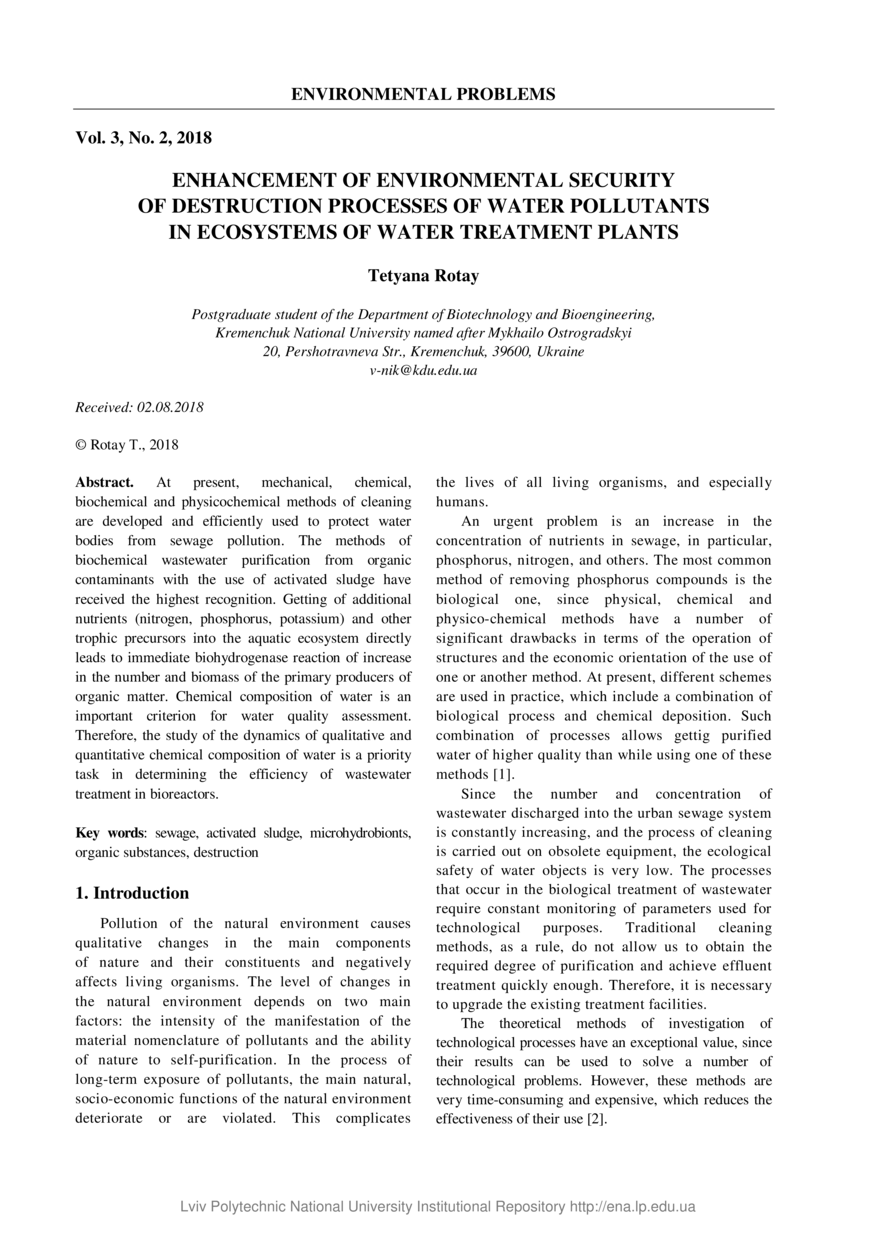 | dc.title | Enhancement of environmental security of destruction processes of water pollutants in ecosystems of water treatment plants | |