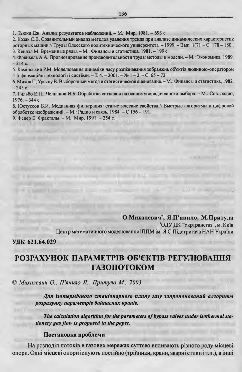 Михалевич О. Розрахунок параметрів об'єктів регулювання газопотоком / О. Михалевич, Я. П'янило, М. Притула // Вісник Національного університету “Львівська політехніка”. — Львів : Видавництво Національного університету “Львівська політехніка”, 2003. — № 481 : Комп'ютерна інженерія та інформаційні технології. — С. 136–142. — (Методи й алгоритми сучасних інформаційних технологій).