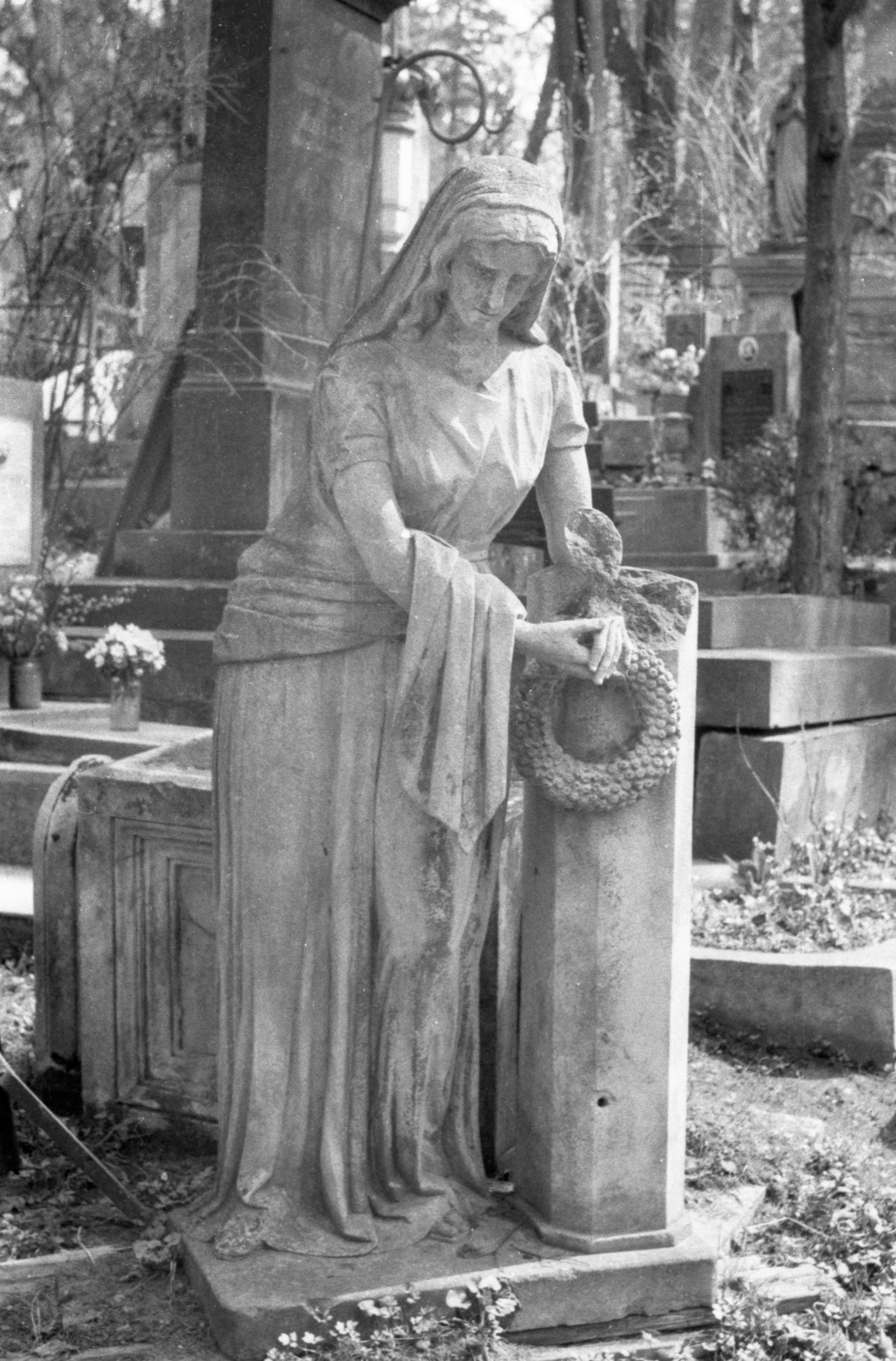 Надгробок — на низькому постаменті скульптура плакальниці, яка сперлась на обламану колону і в руках тримає вінок.