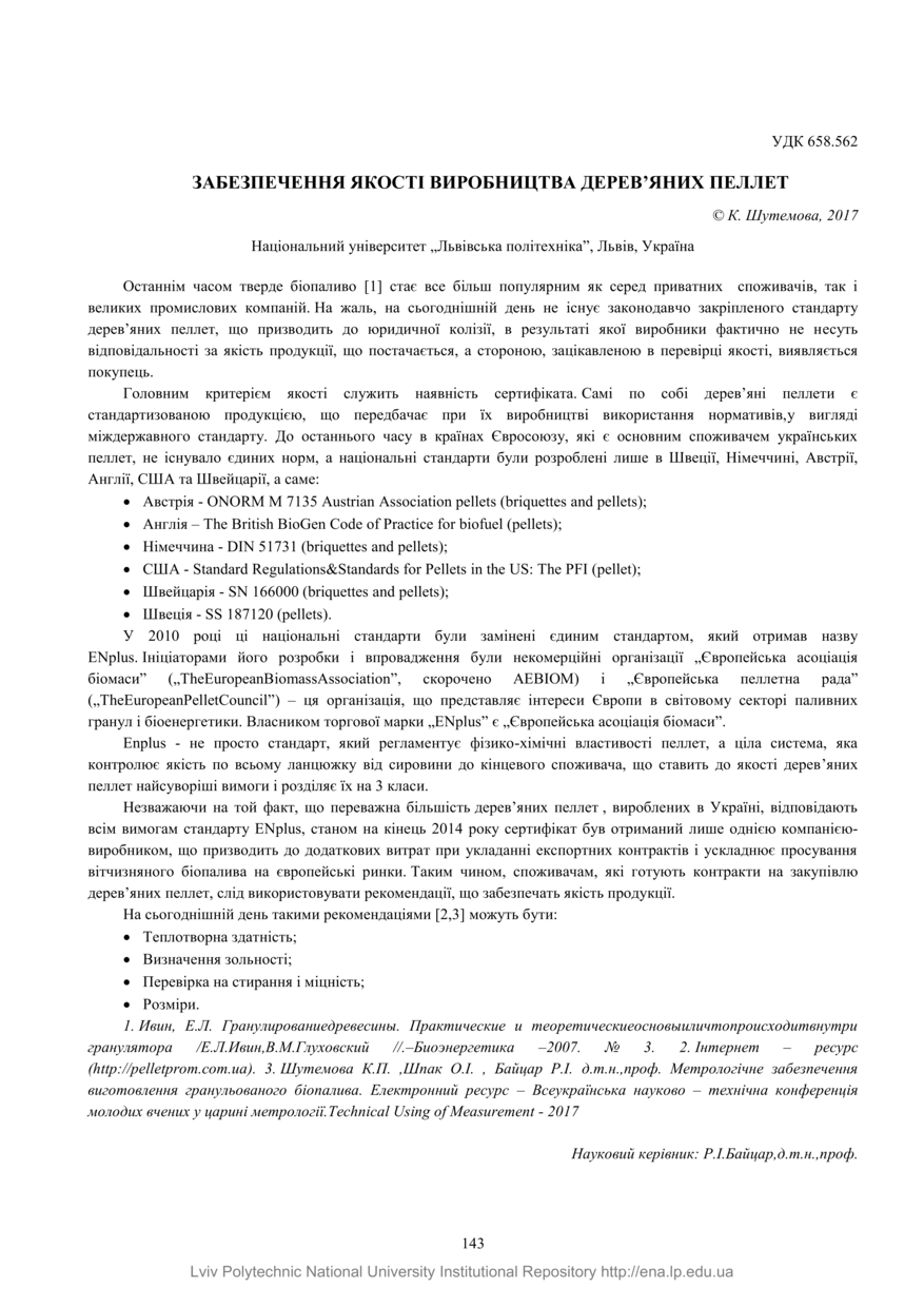Шутемова К. Забезпечення якості виробництва дерев’яних пеллет / К. Шутемова // Управління якістю в освіті та промисловості: досвід, проблеми та перспективи : тези доповідей III Міжнародної науково-практичної конференції пам’яті професора Петра Столярчука, Львів, 11–12 травня 2017 року. — Львів : Видавництво Львівської політехніки, 2017. — С. 143. — (Управління якістю у сфері освіти, науки та промисловості).