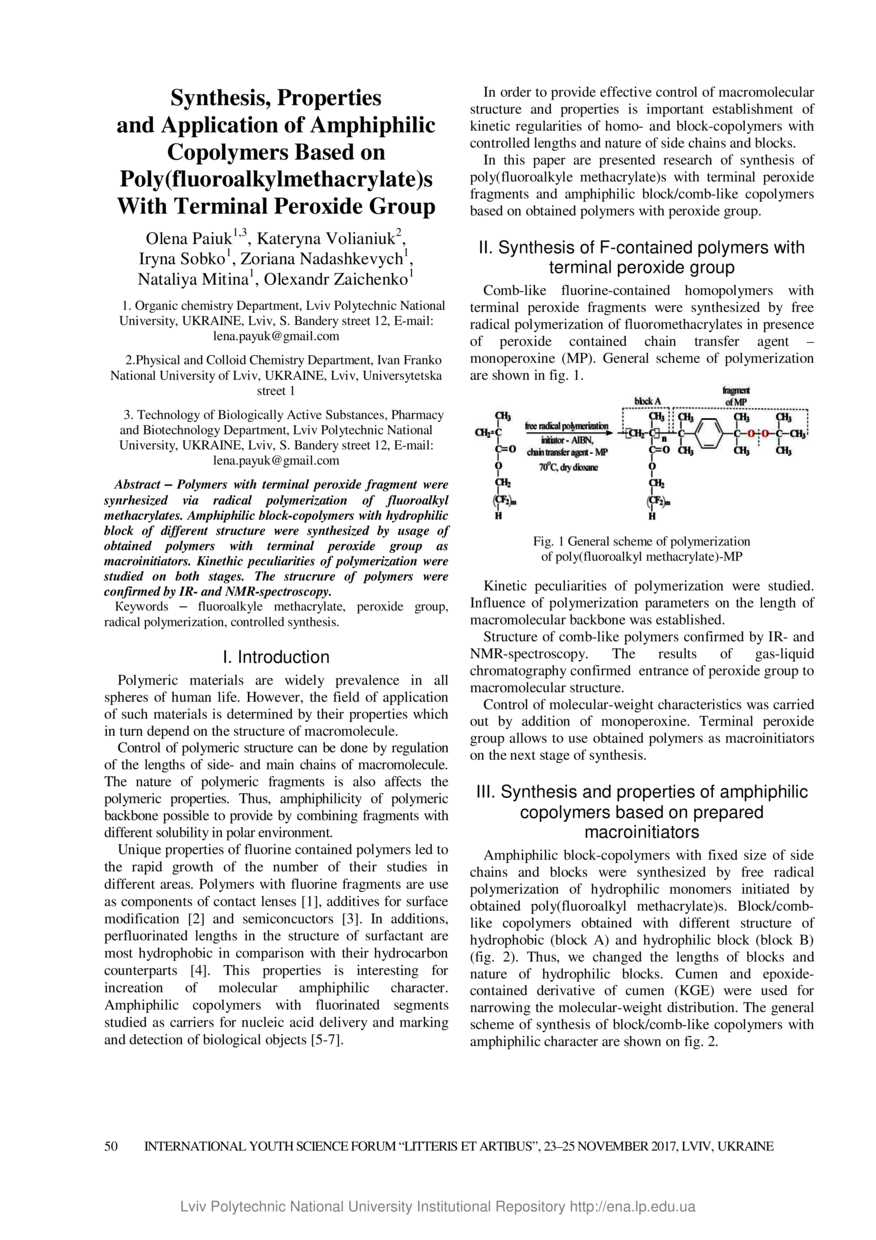 Synthesis, properties and application of amphiphilic copolymers based on poly(fluoroalkylmethacrylate)s with terminal peroxide group / Olena Paiuk, Kateryna Volianiuk, Iryna Sobko, Zoriana Nadashkevych, Nataliya Mitina, Olexandr Zaichenko // Litteris et Artibus : proceedings, 23–25 November, 2017. — Lviv : Lviv Polytechnic Publishing House, 2017. — P. 50–51. — (6th International academic conference «Chemistry & chemical technology 2017» (CCT-2017)).