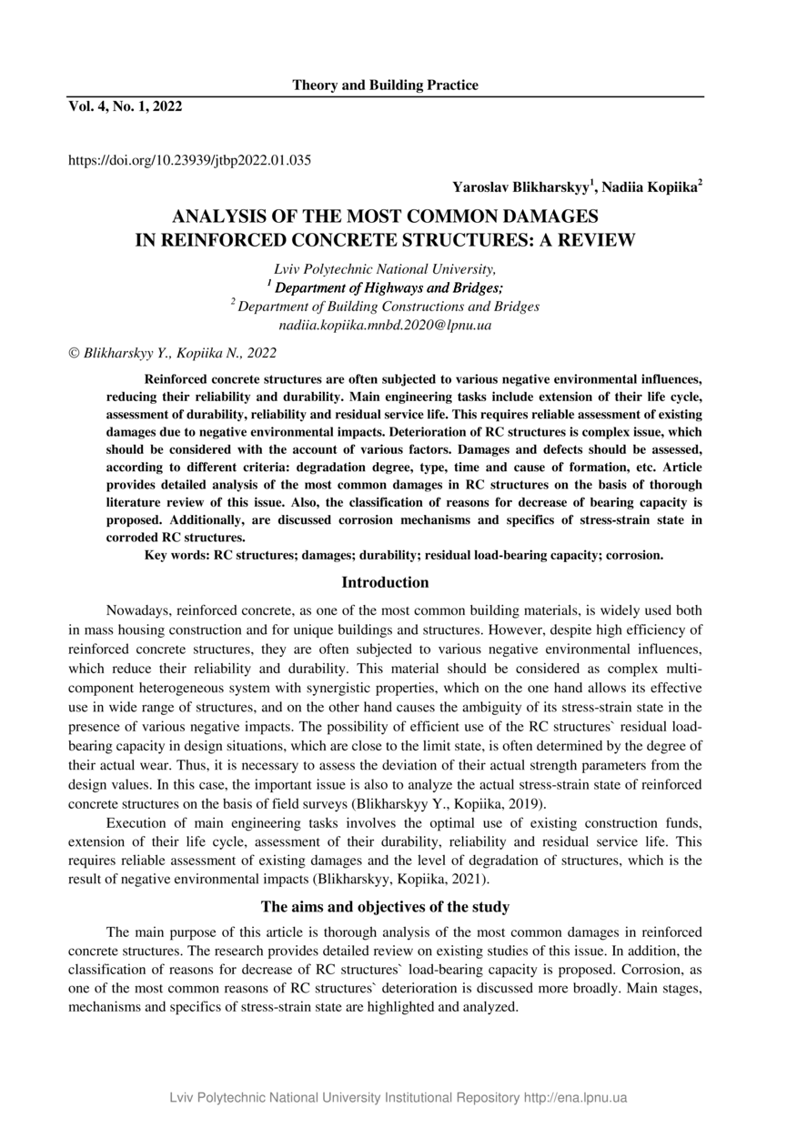 | dc.identifier.citationen | Blikharskyy Y. Analysis of the most common damages in reinforced concrete structures: a review / Yaroslav Blikharskyy, Nadiia Kopiika // Theory and Building Practice. — Lviv : Lviv Politechnic Publishing House, 2022. — Vol 4. — No 1. — P. 35–42. | |
