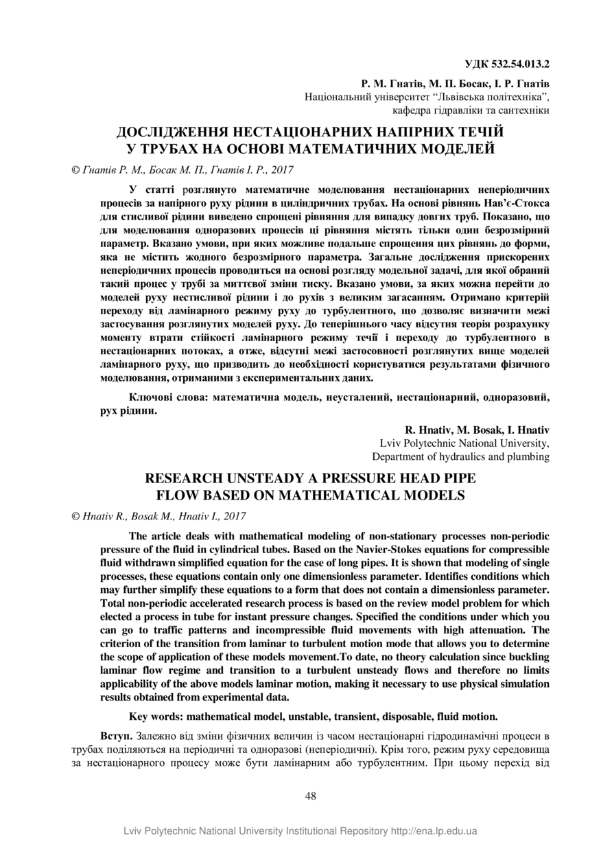Гнатів Р. М. Дослідження нестаціонарних напірних течій у трубах на основі математичних моделей / Р. М. Гнатів, М. П. Босак, І. Р. Гнатів // Вісник національного університету “Львівська політехніка”. Серія: Теорія і практика будівництва. — Львів : Видавництво Львівської політехніки, 2017. — № 877. — С. 48–52.