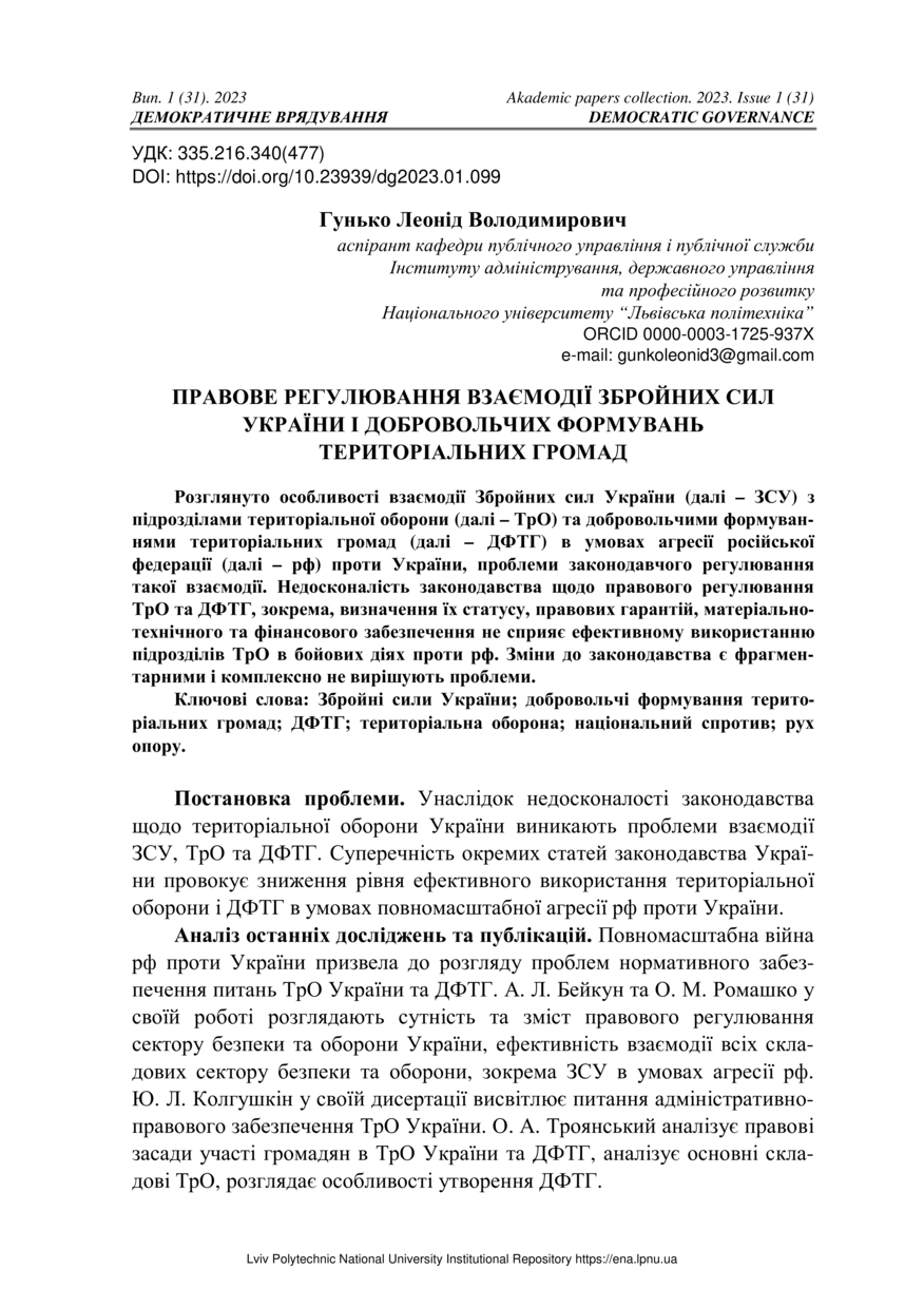 Гунько Л. В. Правове регулювання взаємодії Збройних сил України і добровольчих формувань територіальних громад / Леонід Володимирович Гунько // Демократичне врядування. — Львів : Видавництво Львівської політехніки, 2023. — Том 1(31). — С. 99–107.