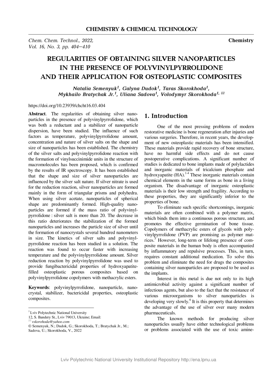 | dc.identifier.citationen | Regularities of Obtaining Silver Nanoparticles in the Presence of Polyvinylpyrrolidone and Their Application for Osteoplastic Composites / Natalia Semenyuk, Halyna Dudok, Taras Skorokhoda, Mykhailo Bratychak Jr., Uliana Sadova, Volodymyr Skorokhoda // Chemistry & Chemical Technology. — Lviv : Lviv Politechnic Publishing House, 2022. — Vol 16. — No 3. — P. 404–410. | |