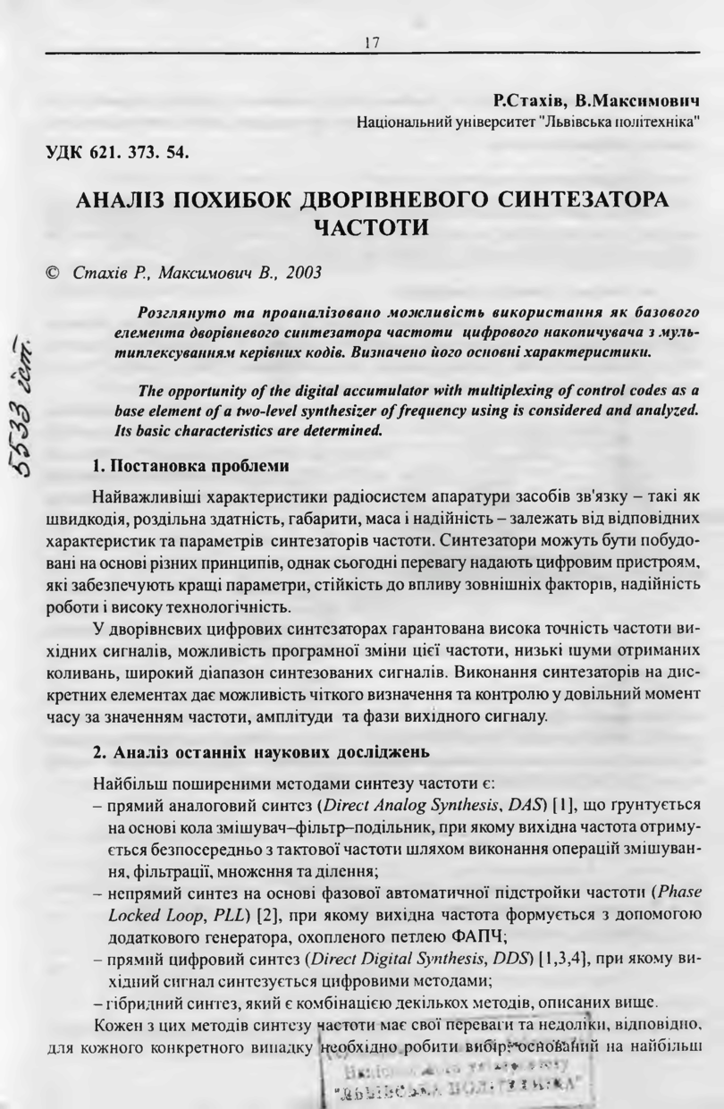 Стахів Р. Аналіз похибок дворівневого синтезатора частоти / Р. Стахів, В. Максимович // Вісник Національного університету “Львівська політехніка”. — Львів : Видавництво Національного університету “Львівська політехніка”, 2003. — № 496 : Комп'ютерна інженерія та інформаційні технології. — С. 17–22. — (Архітектура та компоненти комп'ютерних систем).