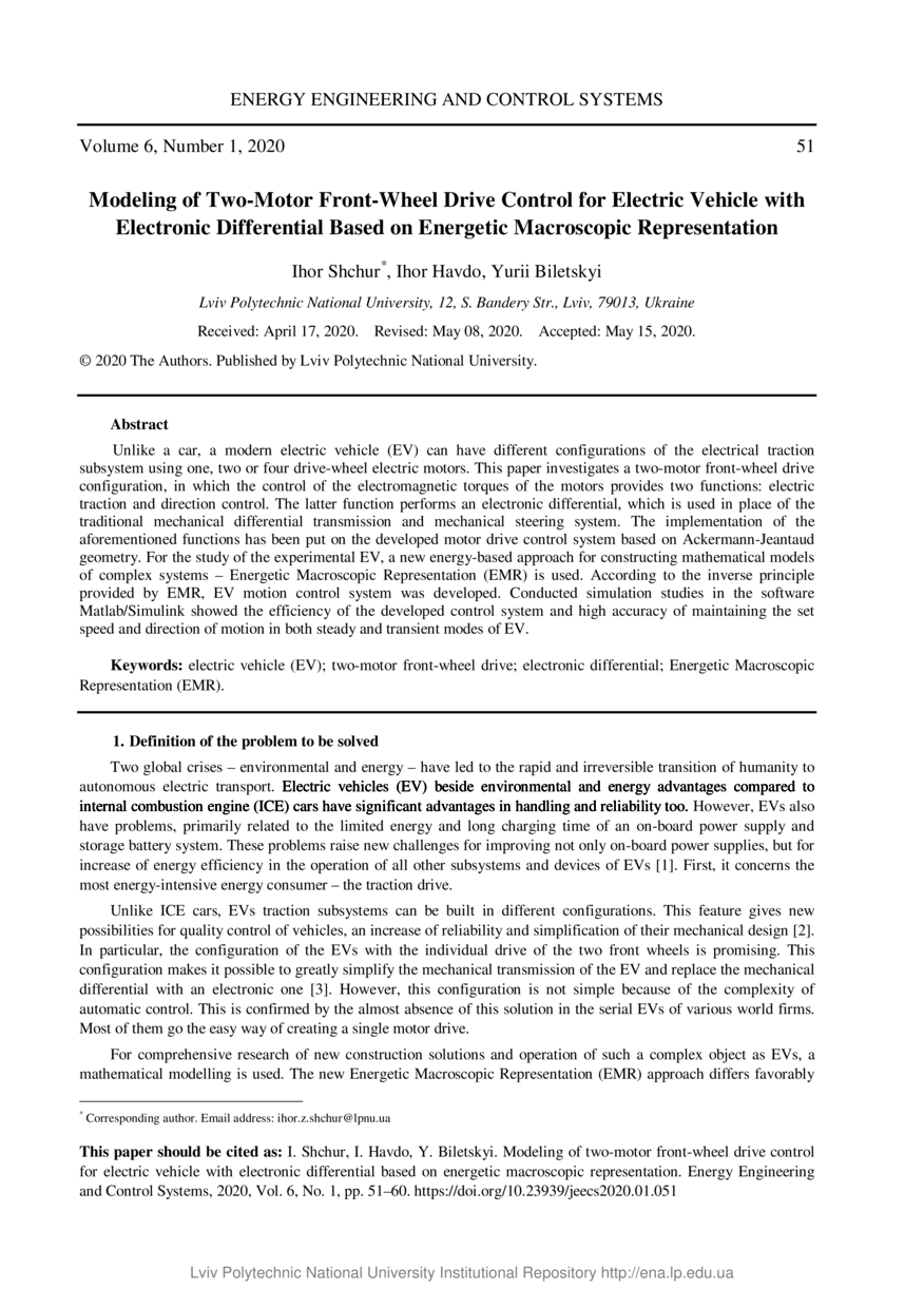 Shchur I. Modeling of two-motor front-wheel drive control for electric vehicle with electronic differential based on energetic macroscopic representation / Ihor Shchur, Ihor Havdo, Yurii Biletskyi // Energy Engineering and Control Systems. — Lviv : Lviv Politechnic Publishing House, 2020. — Vol 6. — No 1. — P. 51–60.