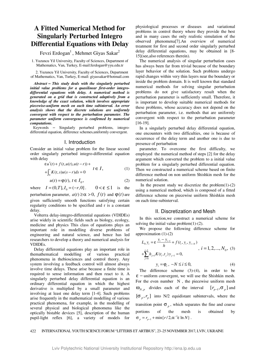 Erdogan F. A fitted numerical method for singularly perturbed integro differential equations with delay / Fevzi Erdogan, Mehmet Giyas Sakar // Litteris et Artibus : proceedings, 23–25 November, 2017. — Lviv : Lviv Polytechnic Publishing House, 2017. — P. 422–424. — (9th International academic conference «Computer science & engineering 2017» (CSE-2017)).