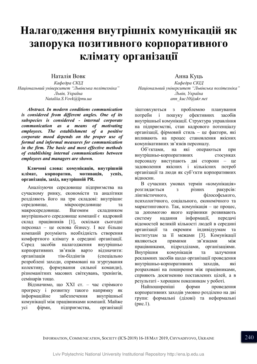 Вовк Н. Налагодження внутрішніх комунікацій як запорука позитивного корпоративного клімату організації / Наталія Вовк, Анна Куць // Інформація, комунікація, суспільство 2019 : матеріали 8-ої Міжнародної наукової конференції ІКС-2019, 16-18 травня 2019 року, Чинадієво. — Львів : Видавництво Львівської політехніки, 2019. — С. 240–241. — (Соціальні комунікації).