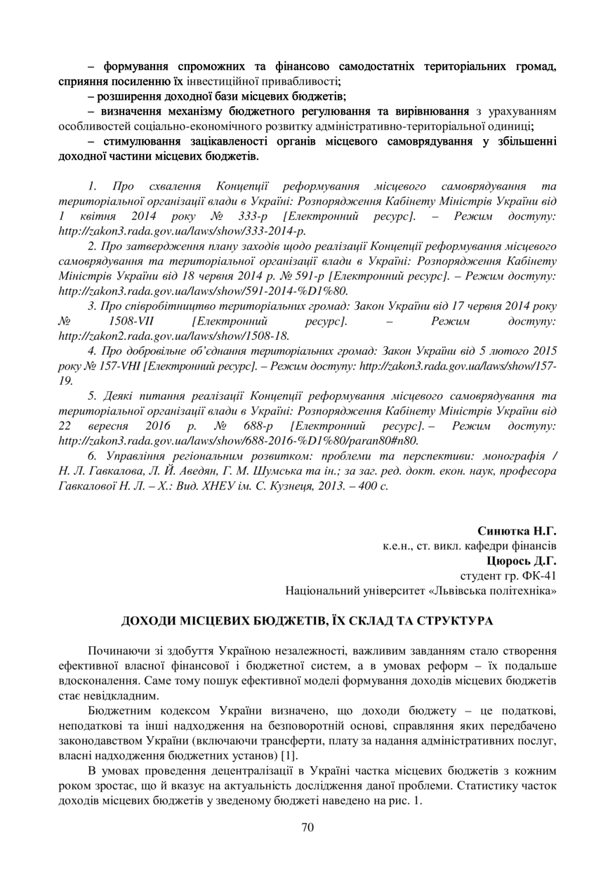 Синютка Н. Г. Доходи місцевих бюджетів, їх склад та структура / Н. Г. Синютка, Д. Г. Цюрось // Управління економічними процесами на макро- і мікрорівні: проблеми та перспективи вирішення : матеріали ІІІ Міжнародної науково-практичної інтернет-конференції молодих учених, 24–25 квітня 2018 р., Львів. — Львів : Видавництво Львівської політехніки, 2018. — С. 70–72. — (Регіональне управління економікою на засадах інноваційного розвитку).